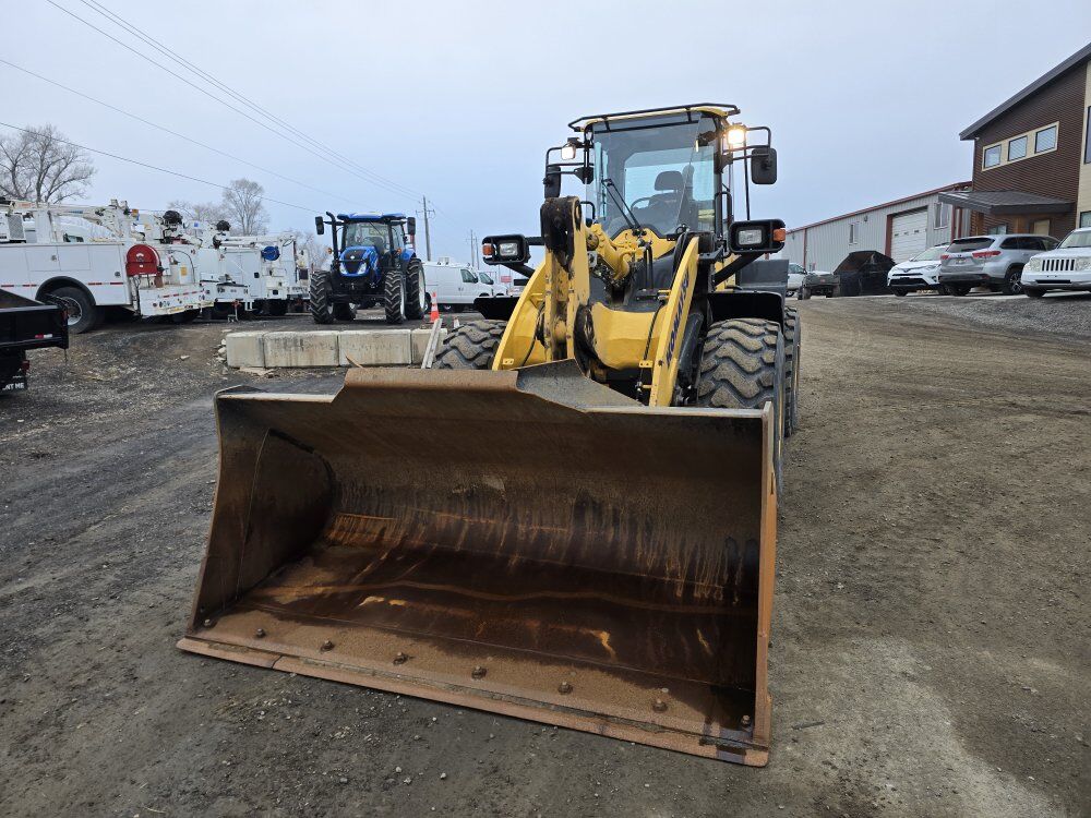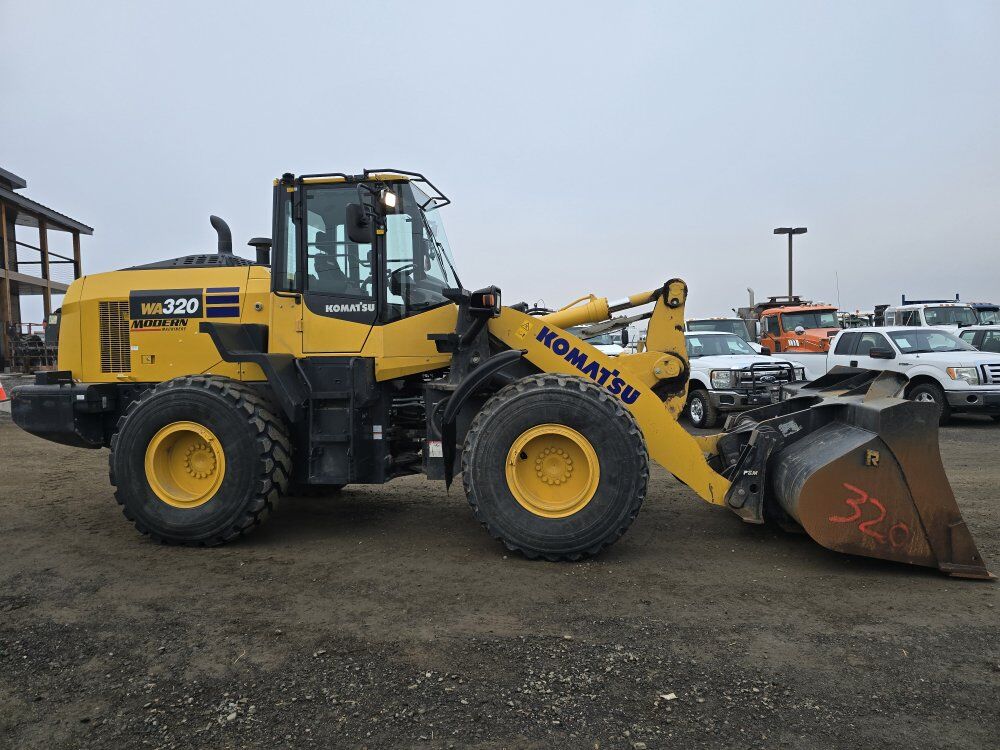 2024 Komatsu WA320-8 front end wheel loader, 165 horsepower Komatsu diesel engine, 1,600 hours, hydrostatic transmission with active braking, ride control, backup camera, heated seat, quick attach, 3.5 yard bucket, material forks available, good tires, former fleet machine 208-734-3434