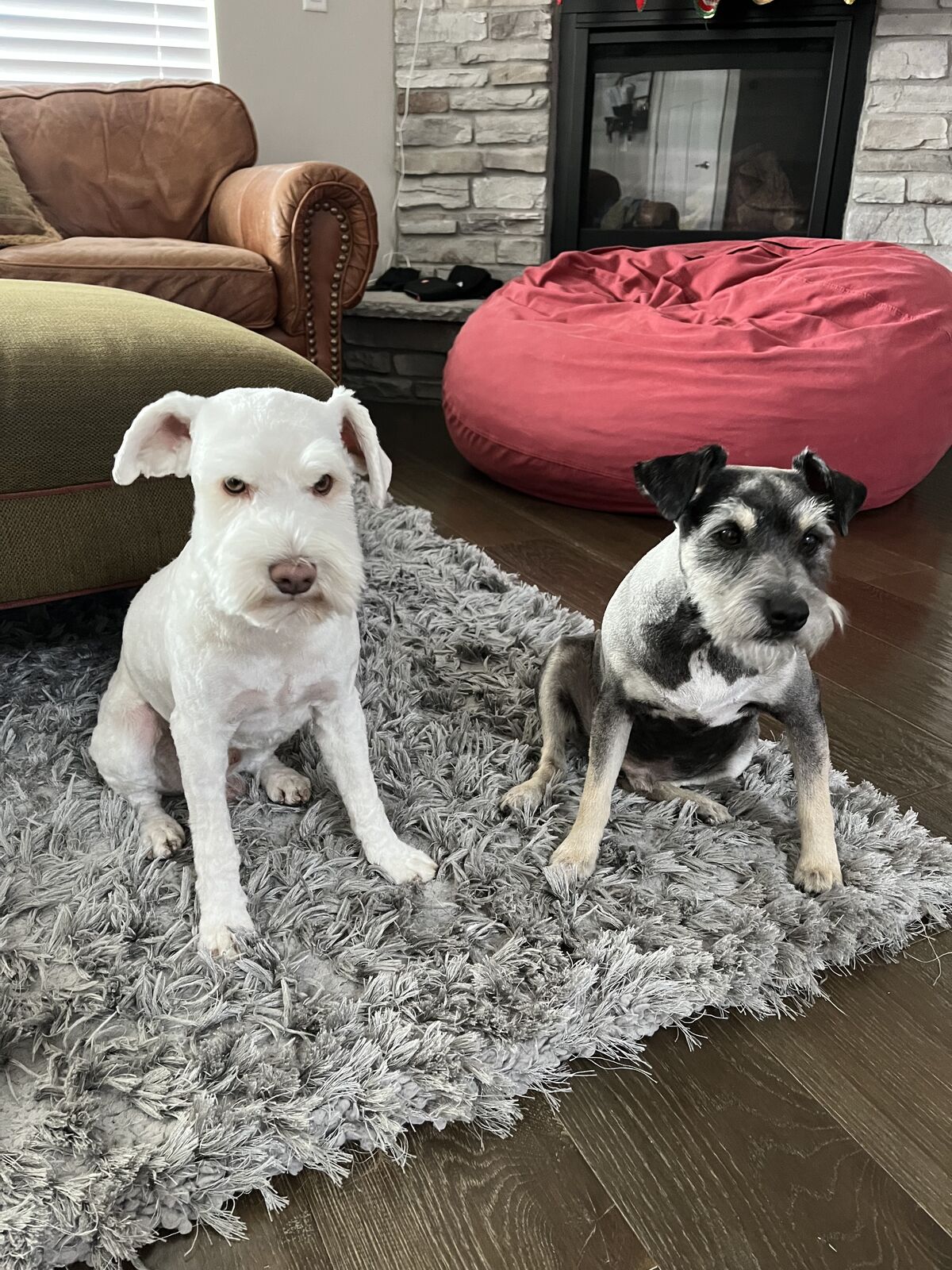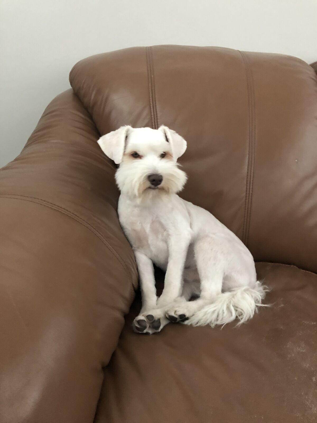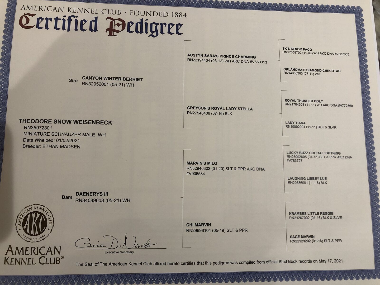Theo is a pure bread mini schnauzer with a white mega coat. He is the most mild mannered dog I’ve ever owned and his coat is easy on my daughters allergies. He is healthy and up to date on all his shots.