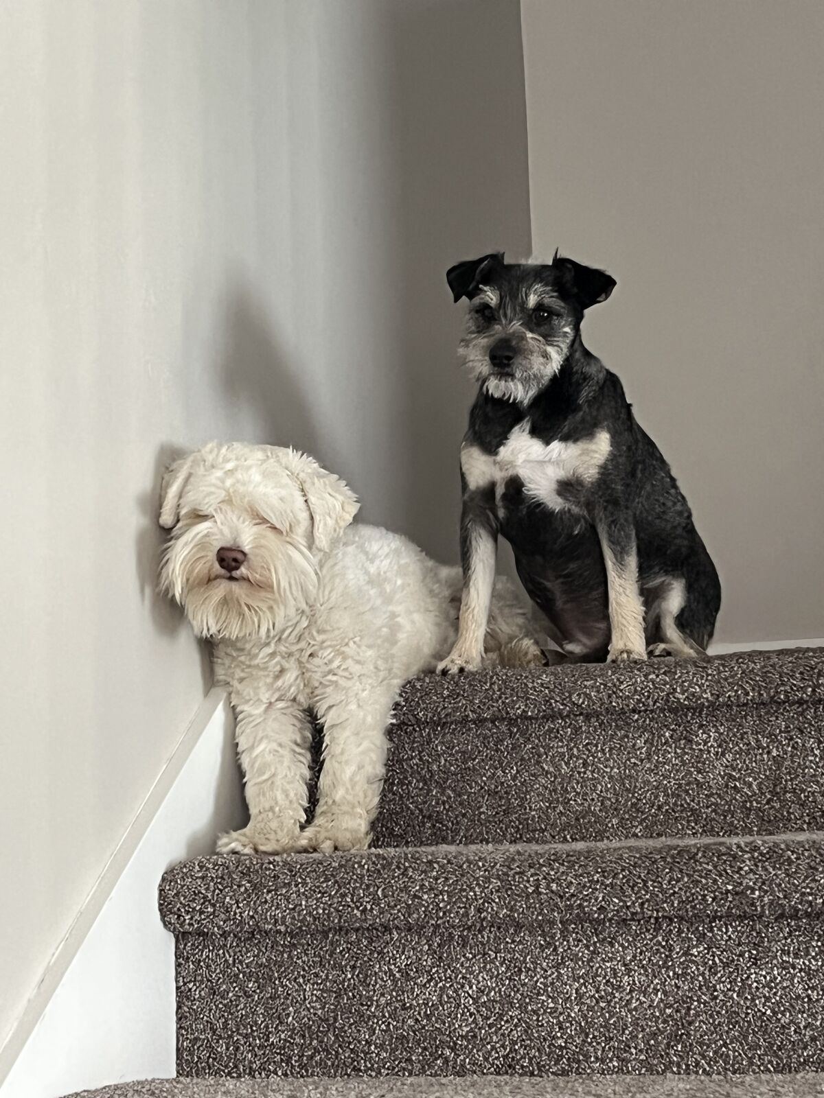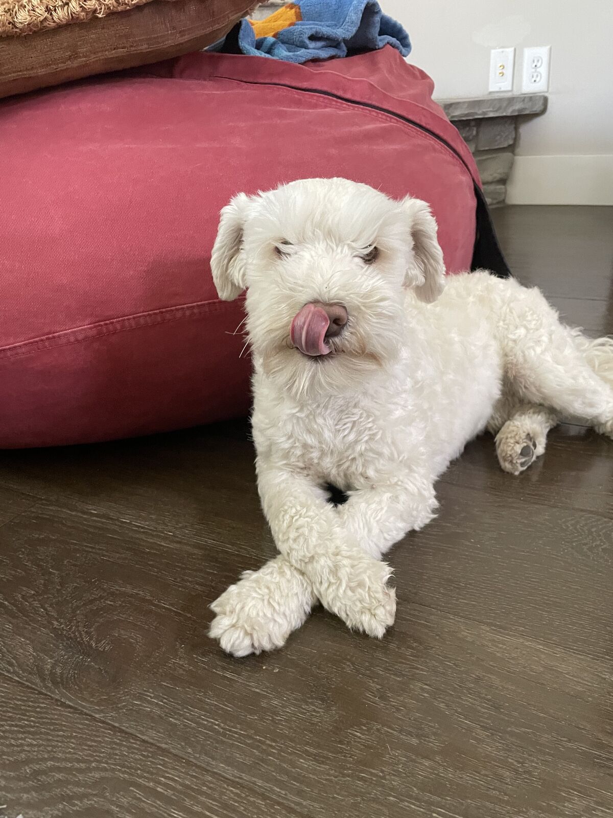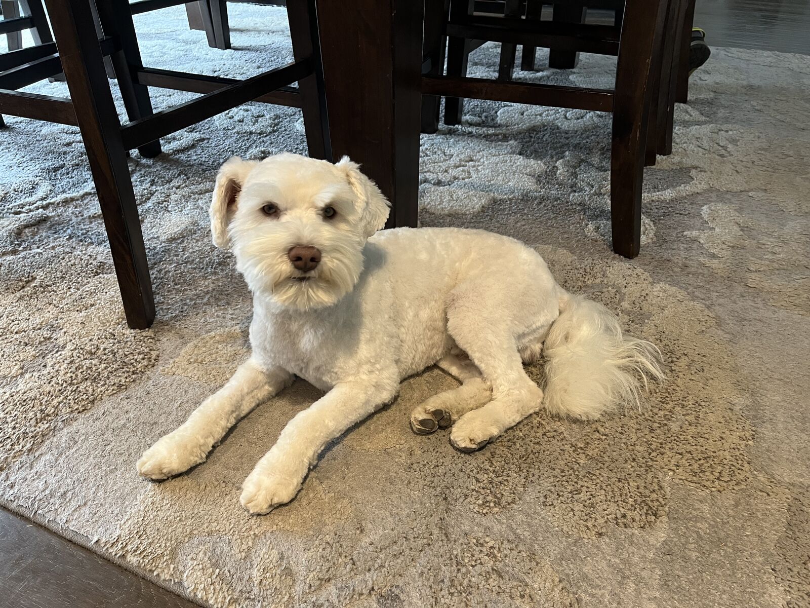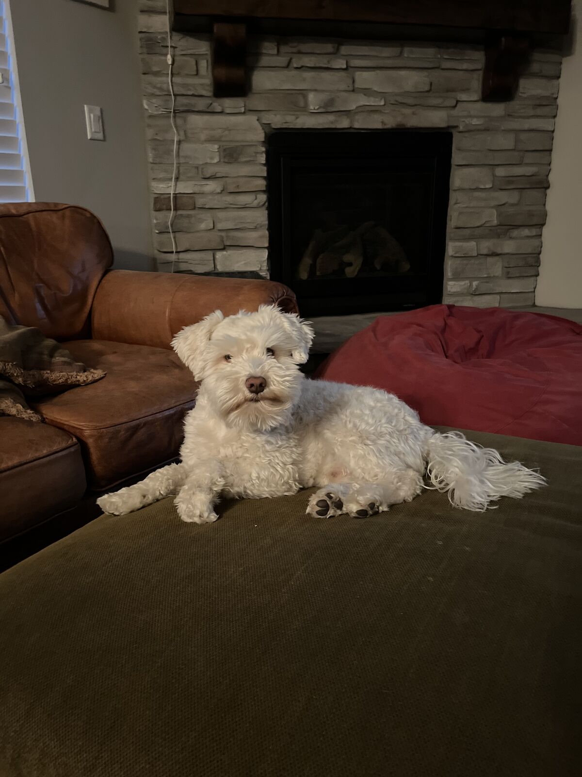 Theo is a pure bread mini schnauzer with a white mega coat. He is the most mild mannered dog I’ve ever owned and his coat is easy on my daughters allergies. He is healthy and up to date on all his shots.