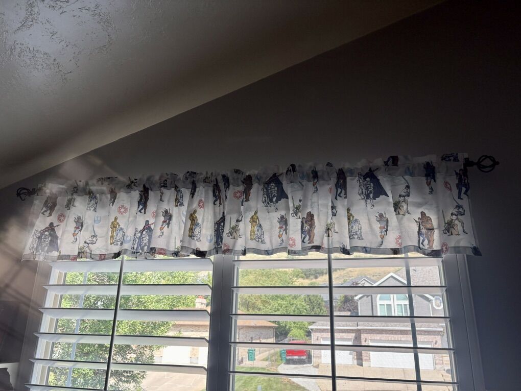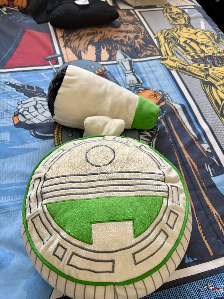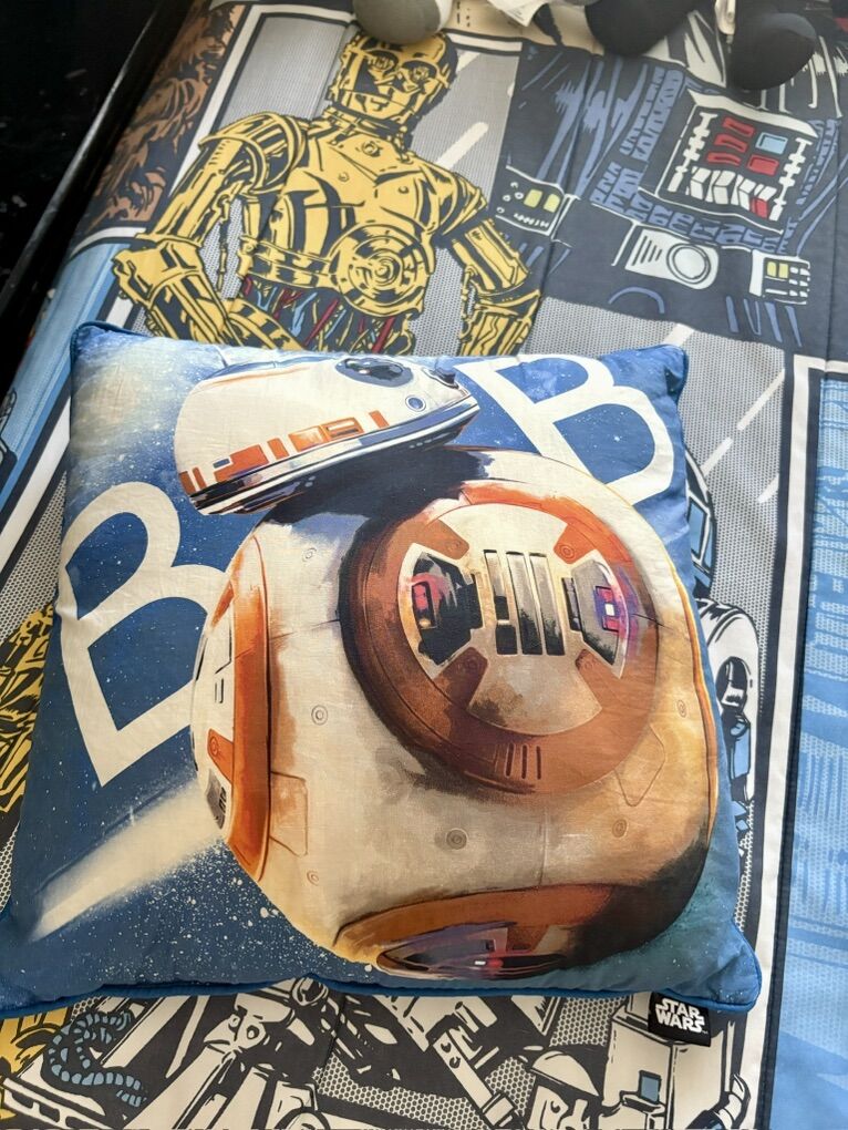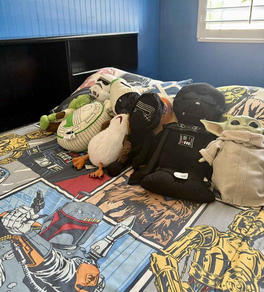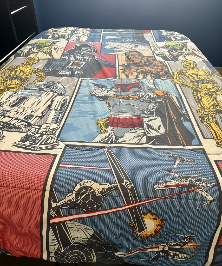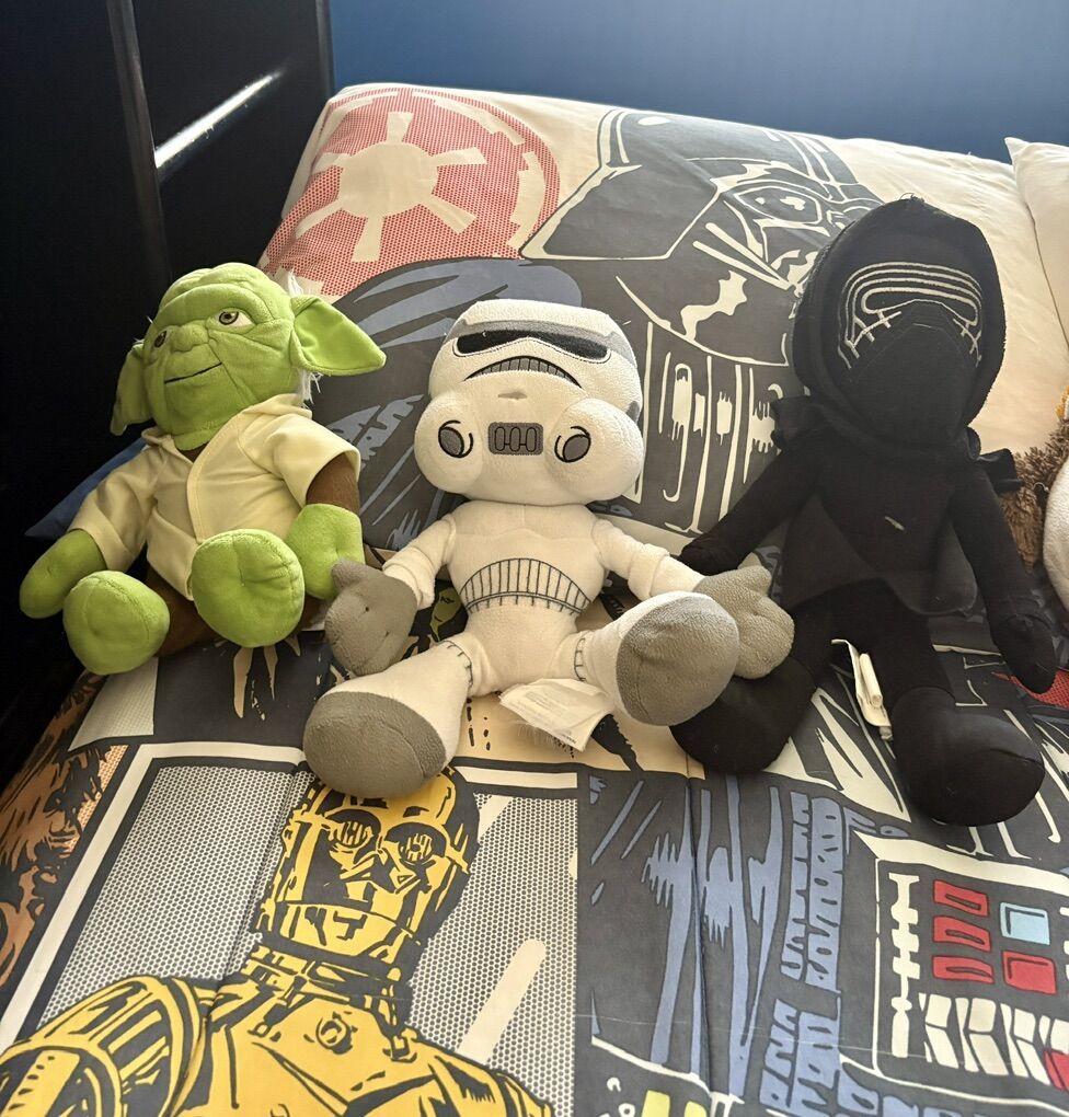 VenmoFull size Star Wars bedding set. Reversible bedspread. Comes with two sets of sheets, window valance and all the Star Wars character plushies you see listed. In good condition. Smoke free home.