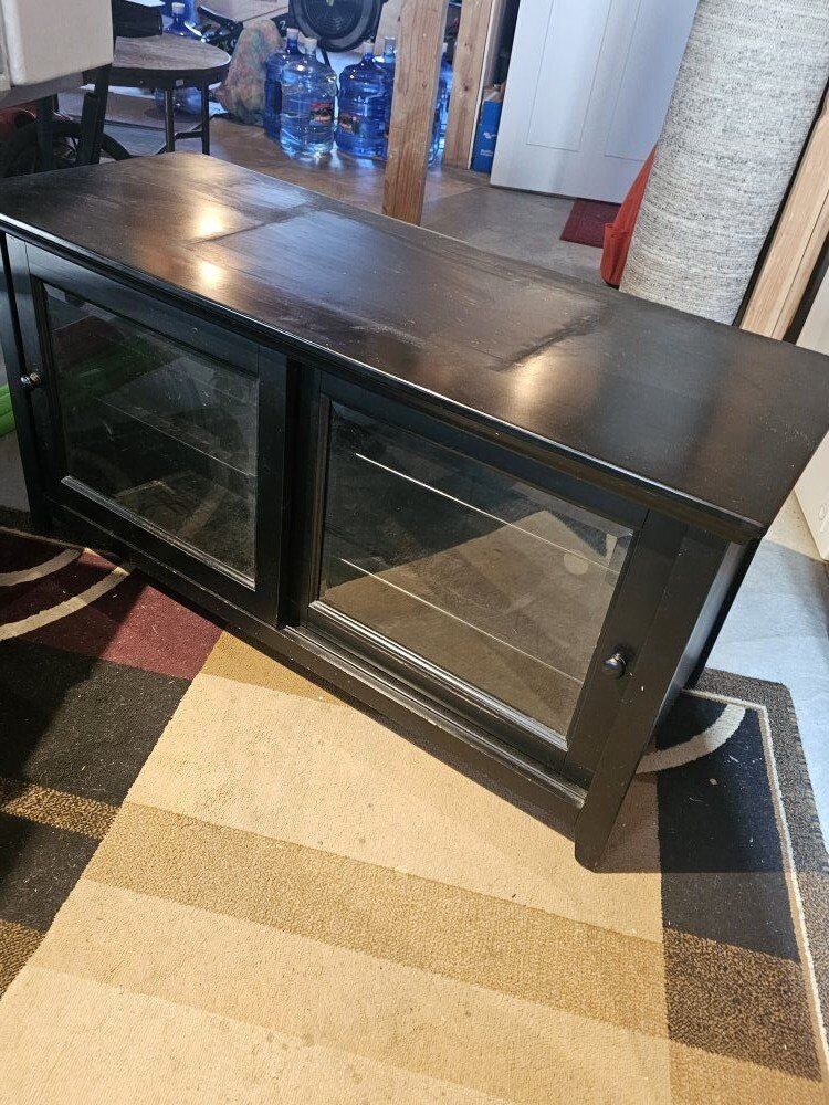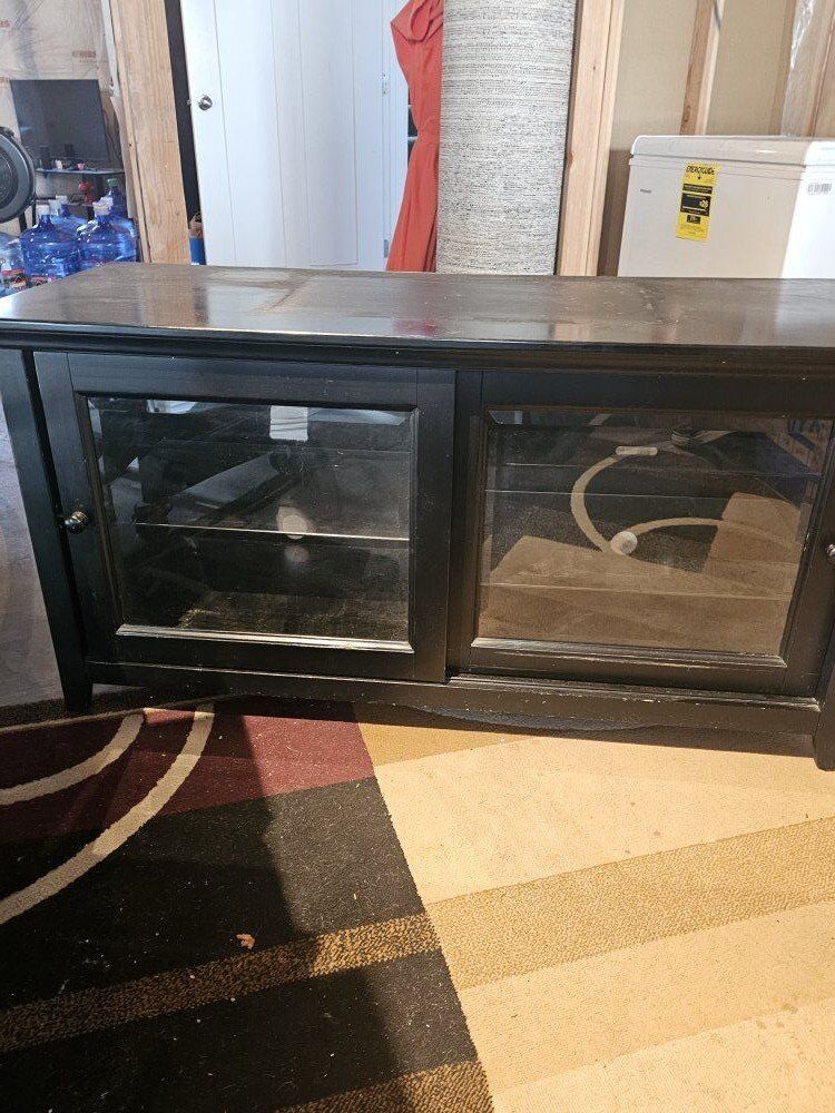 VenmoBlack 2-Door TV Stand -Length 50inch, Width 20inch, Height 25inch -Easily Holds 65inch TV -Shelves-4inch -Lots of Storage! for PS5, PS4, Movies, CDs, etc -Few scratches, one slight chip -Very Heavy Duty
