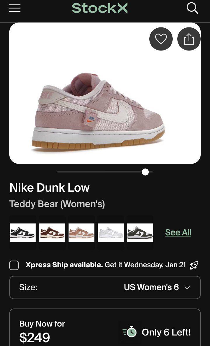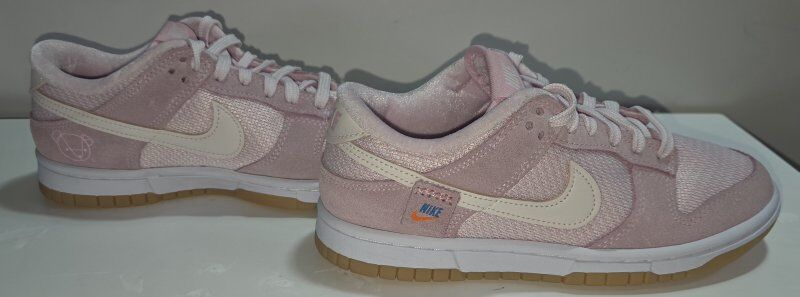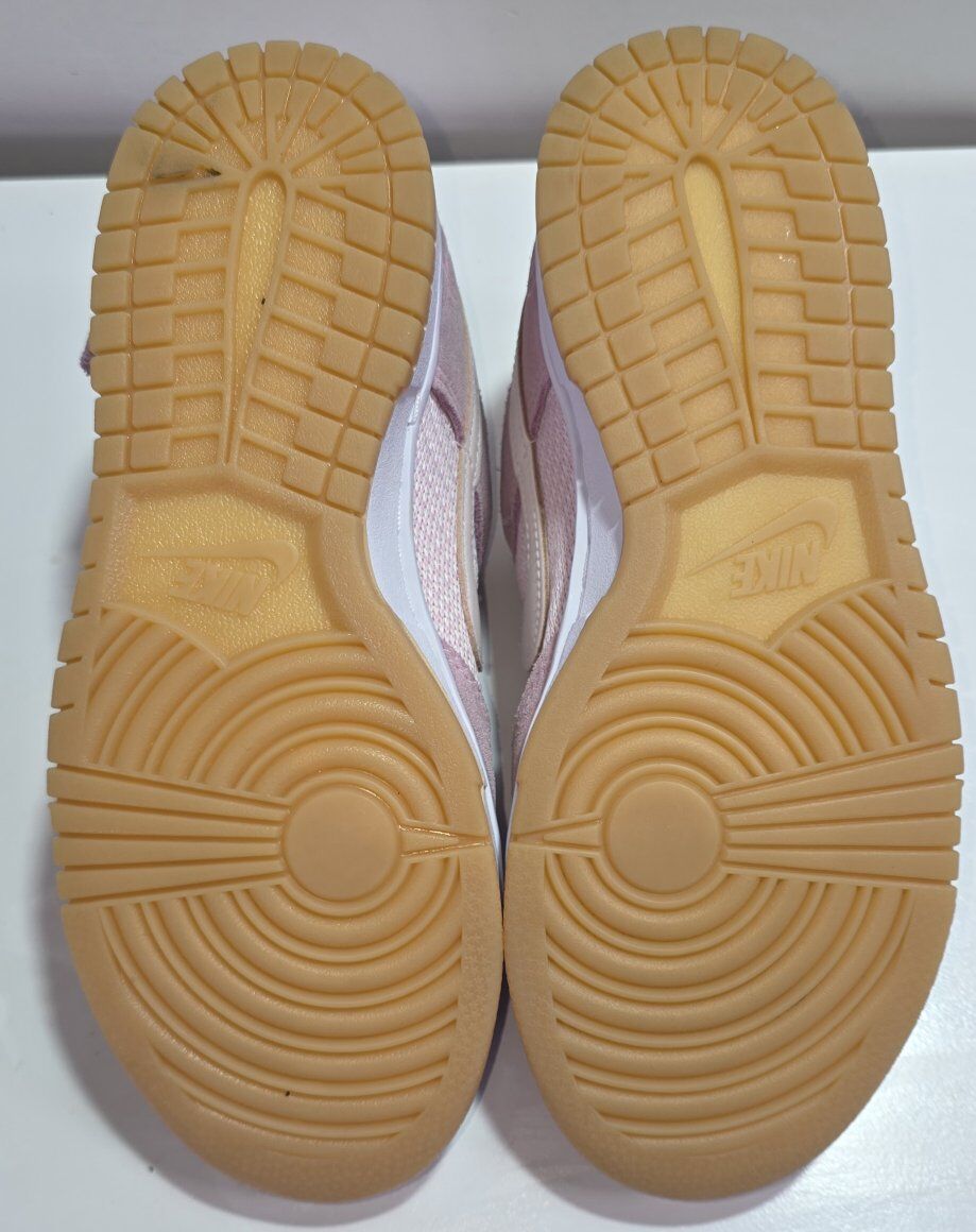 Pre-Owned Nike Women's Dunk Low 'Teddy Bear - Light Soft Pink'. In excellent conditions. Women's U.S. size 6, which typically corresponds to a kids' grade school size 4.5Y. The shoe is crafted with a pink knit textile base and tonal suede overlays, creating a soft, plush look. It features a unique suede "Nike" tag on the side of the off-white leather Swoosh and has a soft, velveteen lining for comfort. A small teddy bear graphic detail is also featured on the inner heel and footbed. See all photos, text message is better, see my other adds. thank you.