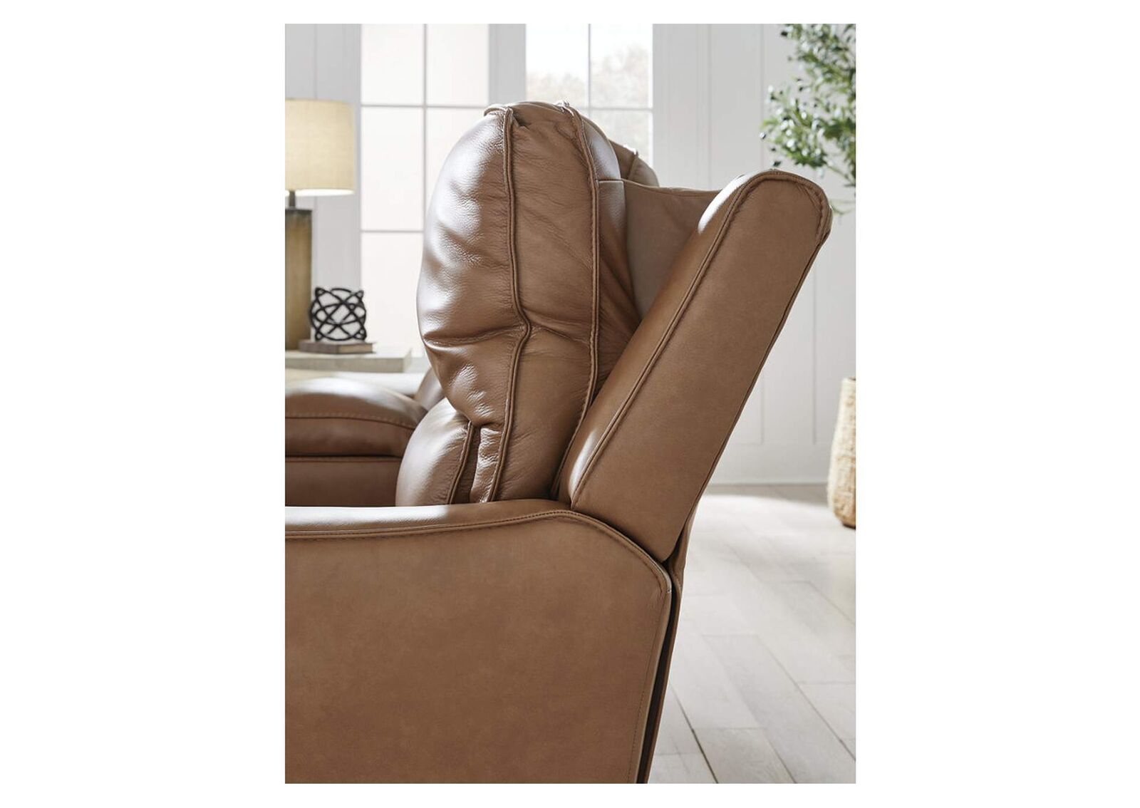 Live and lounge luxuriously. This power reclining sofa brings an ultra-stylish flair to your home’s central hub. Its seating area is wrapped in top-grain leather in a rich caramel coloration, giving you a trend-right look made all the better with high-quality materials. And with the simple push of a button, you can recline or adjust the headrests to find your ideal comfort position.