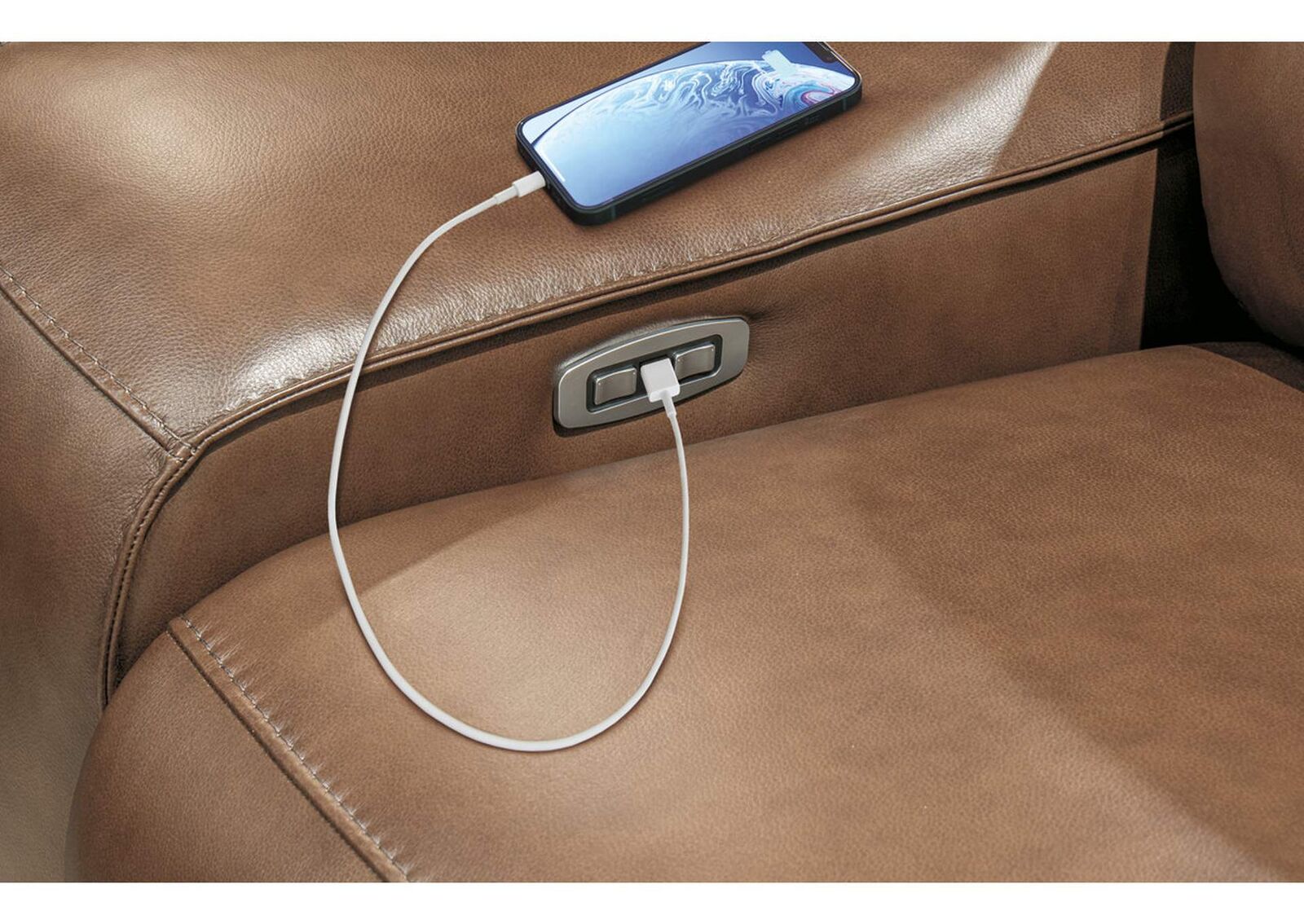 Live and lounge luxuriously. This power reclining loveseat brings an ultra-stylish flair to your home’s central hub. Its seating area is wrapped in top-grain leather in a rich caramel coloration, giving you a trend-right look made all the better with high-quality materials. And with the simple push of a button, you can recline or adjust the headrests to find your ideal comfort position.