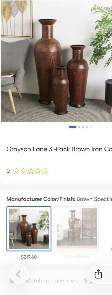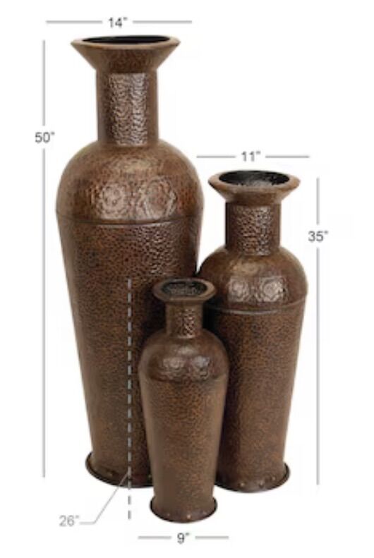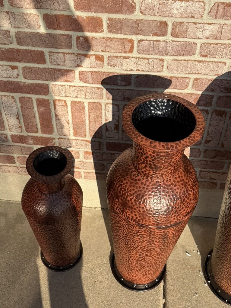 Set of 3 Grayson Lane country-style vases made from durable brown iron. Rustic farmhouse look that works great as floor décor, shelf accents, or entryway pieces. Sturdy, decorative, and perfect for adding a warm vintage touch to any space. Great condition.