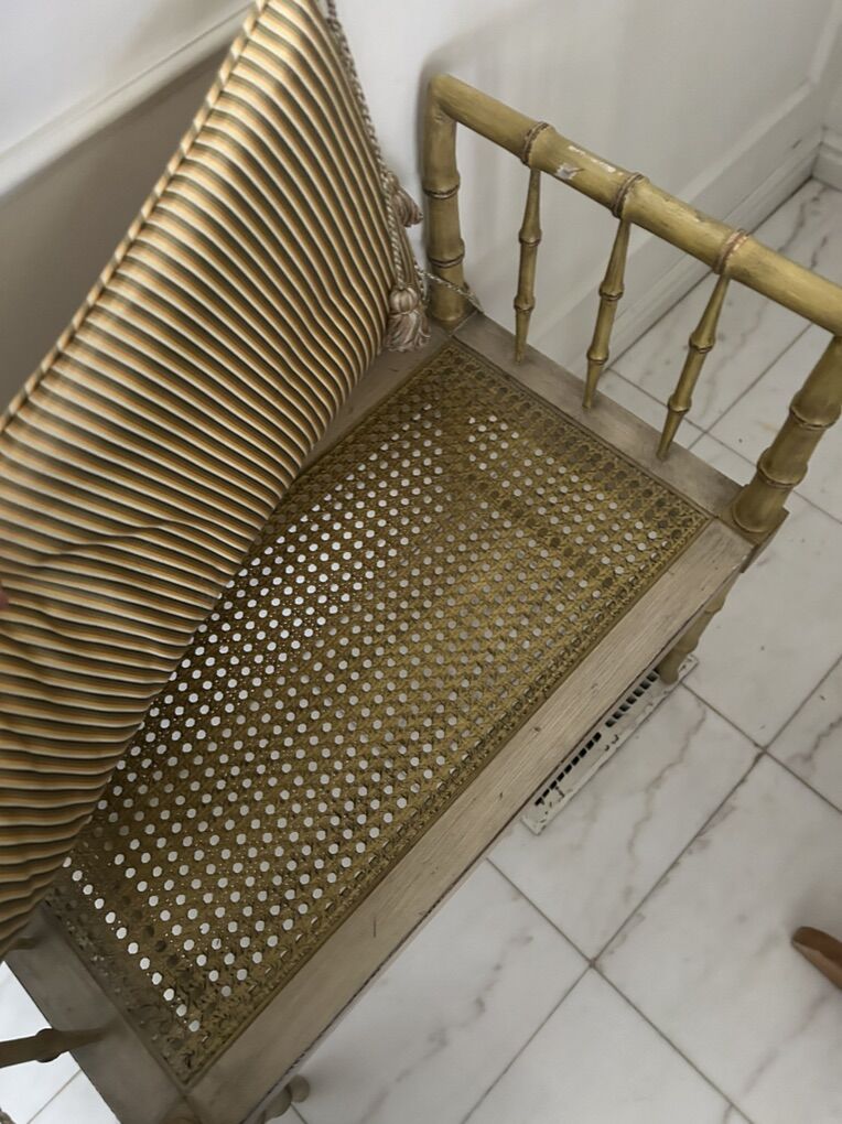 This particular bench showcases the enduring appeal of the faux bamboo motif. The striped upholstery and decorative tassels add a touch of elegance and comfort, characteristic of designer pieces from the latter half of the 20th century. Such furniture is often found in high-end homes and designer showrooms, valued for its decorative qualities and ability to evoke a sense of exoticism and luxury. The caning on this chair is in beautiful condition.