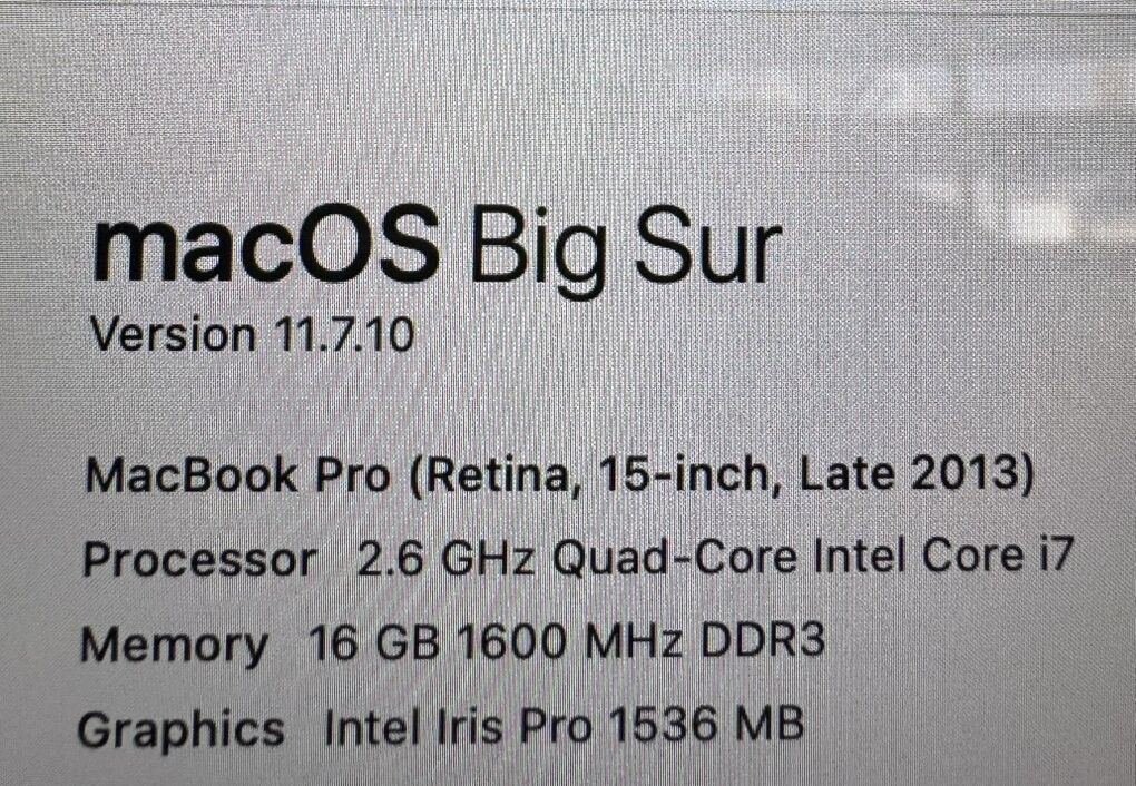 MacBook Pro (Retina, 15-inch, Late 2013) Processor 2.6 GHz Quad-Core Intel Core i7 Memory 16 GB 1600 MHz DDR3 Graphics Intel Iris Pro 1536 MB 256 GB Flash Storage Has been factory reset with the OS clean installed. Comes with the charger.