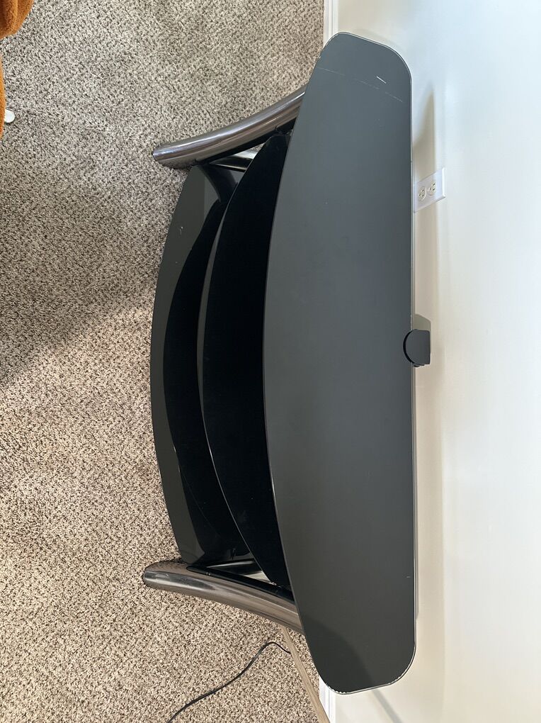 Black glass TV stand/media console approximately 2 1/2 feet tall and 5 1/2 feet wide