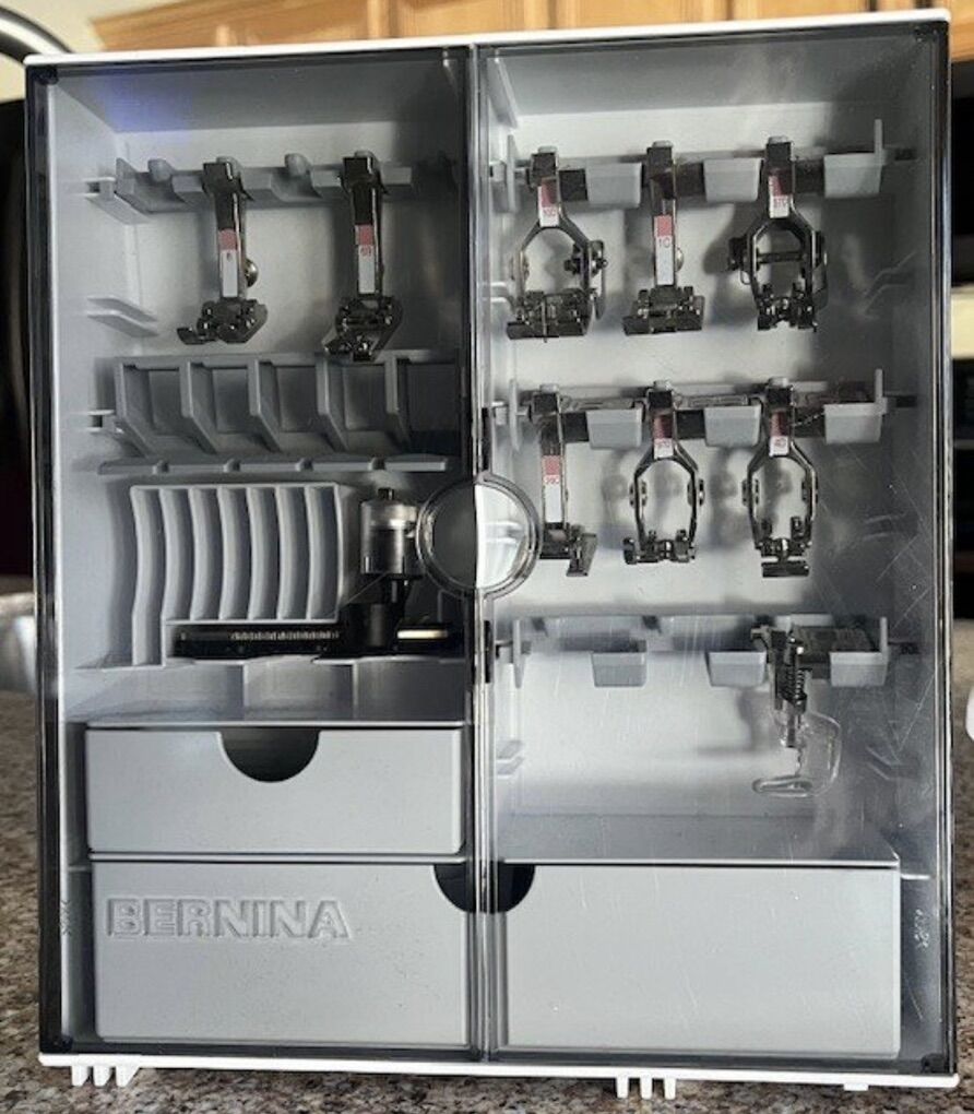 Great machine comes with 9 feet, a walking foot, instruction books, 11 bobbins, accessories, knee lift bar, and case for accesssories. It’s been in the shop for a tuneup within the last year.