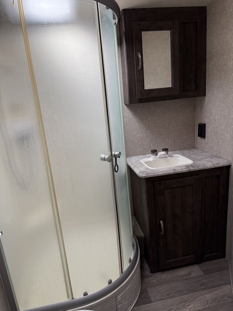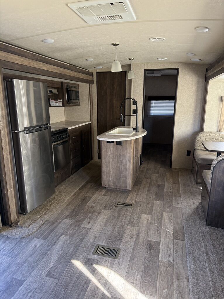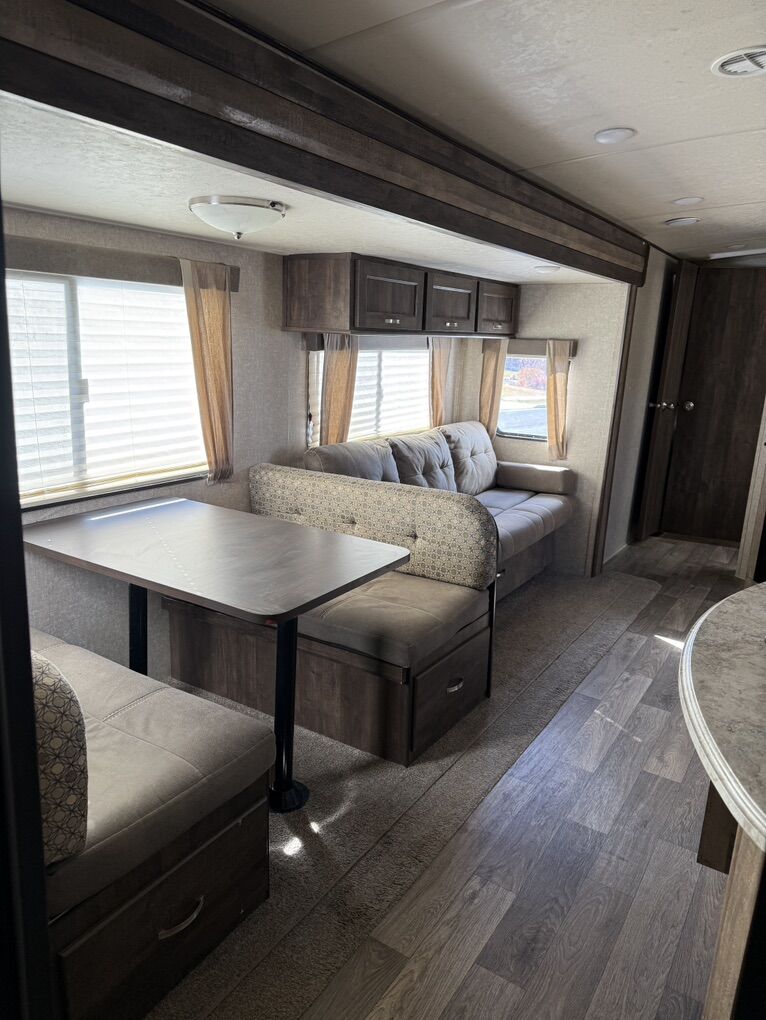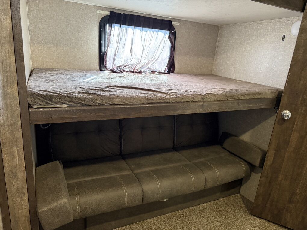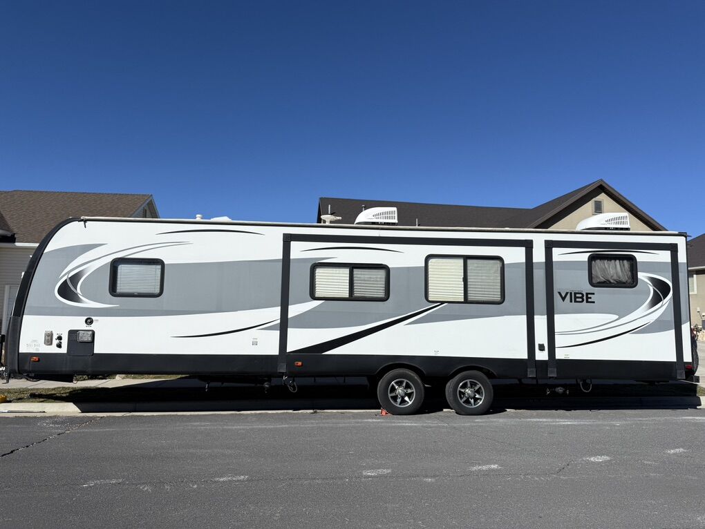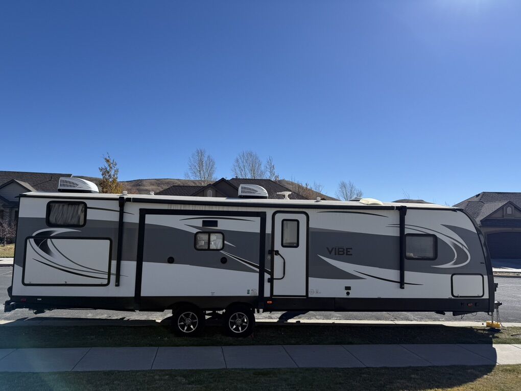2018 forest river vibe 38-foot, 8,044lb UVW family-friendly bunkhouse layout with plenty of storage, clean interior, and everything in good working order. No leaks, no structural issues, and never smoked in. The wall paper does have small wrinkles in places but is not very noticeable and the rear A/C unit in the back does struggle to keep cool in the hot months