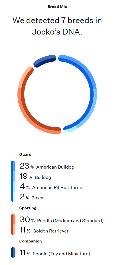 I got him from Facebook Marketplace when he was 8-9 weeks old. His dad is an American Bulldog, and his mom is a Golden Doodle, but you wouldn't guess that from looking at him. I had a DNA test done through Wisdom Panel to confirm his parentage, as well as test for traits and health concerns. This full report is available upon request. He was neutered at Cache Humane Society, and is up to date on all his shots.