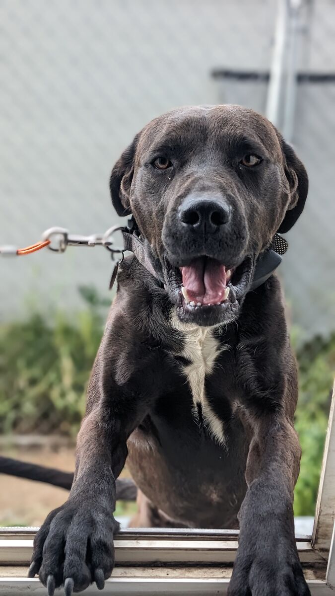 He is extremely nervous about new people, so introductions will need to happen while he wears his muzzle and he gets fed treats. He can be unpredictable at times and has snapped and nipped at people, including my kids. He's never broken the skin, but he has caused nicks and bruises. I think he would thrive on a large property, ideally with other animals that he could be a part of a bigger family and system. He is eager to please and would take to training well with someone who has the knowledge and experience to work with him. He thinks he is a guard dog and could be trained well to fit that purpose if needed.