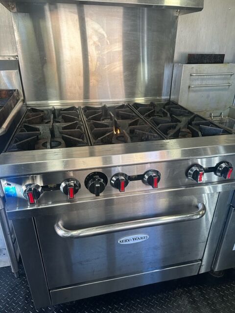 Zelle16×8 dual axle food trailer, ready to work. Clean title in hand. Loaded with commercial equipment and built for high-volume service. 8 ft low-profile hood w/ full fire suppression 6-burner stove w/ oven & removable grill top (3) 35 lb fryers + space/plumbing for a 4th 3-compartment sink + handwash station 40 gal fresh / 46 gal gray water tanks On-demand propane water heater (6 GPM) Sandwich prep table, chest freezer Stainless interior, 4 ft prep table, rack storage LED lighting inside & out 6 ft serving window w/ POS area Collapsible stainless serving shelf Rear & side doors, flag poles (2) 40 lb propane tanks WEN 3800 generator No leaks, all 4 new tires Heat lamps, warming pots, electric warming station Many extras included It's a money maker! Selling because of unexpected life event. Serious buyers only. Message for details or to view.