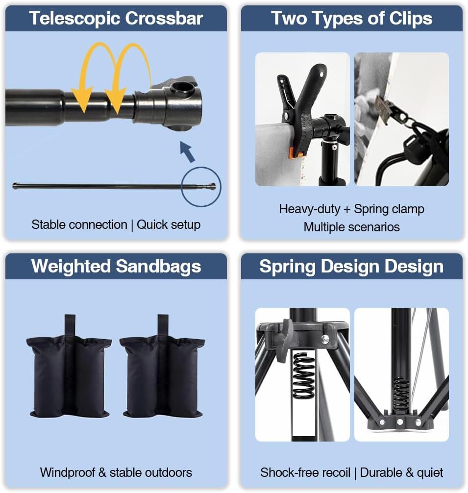 VenmoIncludes: 2 tripods, telescopic crossbar, 8 spring clamps, 4 heavy-duty grips, 2 sandbags & carry bag.