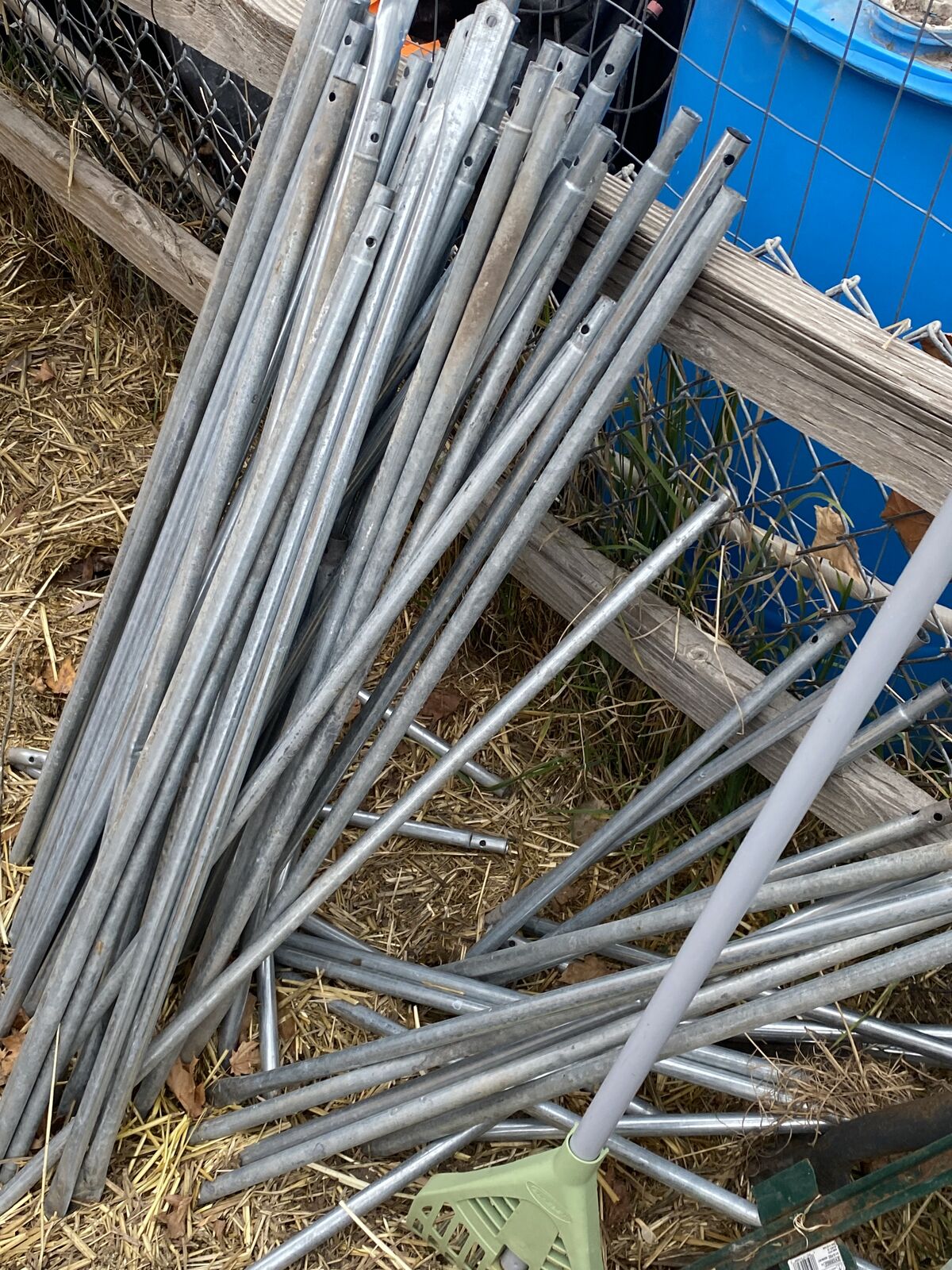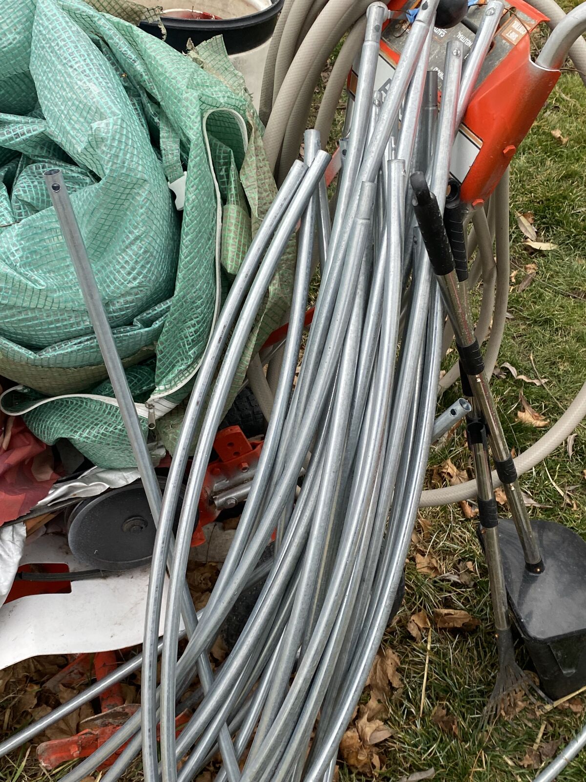 Just as is in pictures.i will give you heavy duty tent spikes with rope to tie it down.this stuff is not what it comes with.also the canvas is still good but the zi only works on 1 side.
