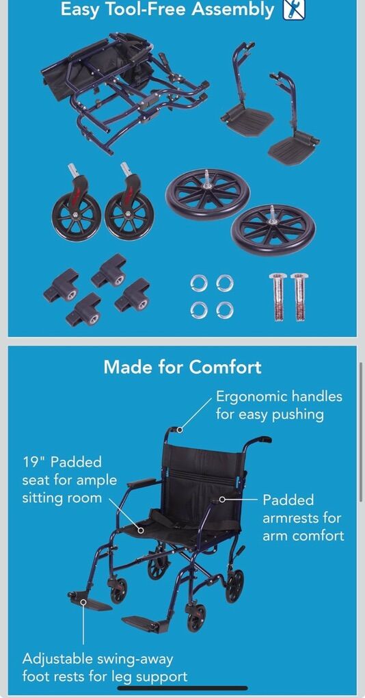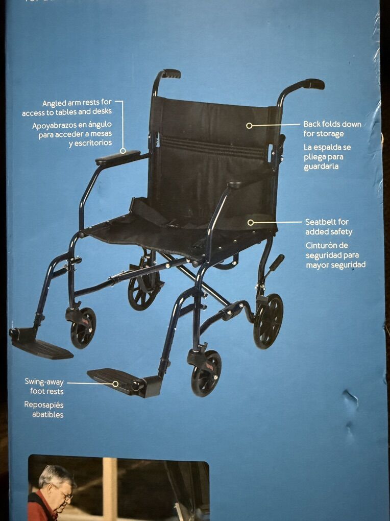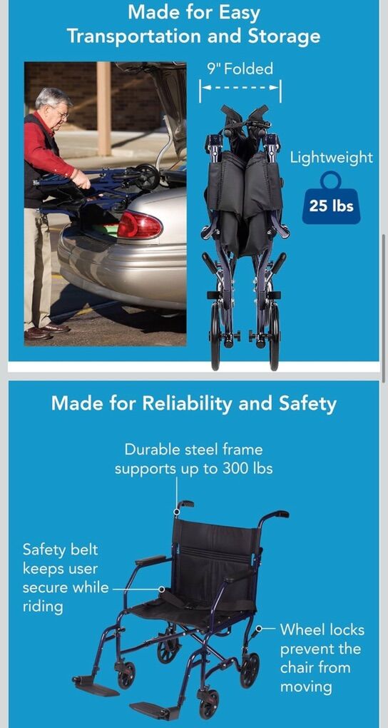 Lightweight wheelchair at 25lbs. The Carex Transport Wheelchair, a portable wheelchair that folds. The Transport Chair features adjustable swing away removable foot rests. The wheel chair has a sturdy steel frame that folds and is portable. A leader in transport chairs. With a 19 inch seat, the transport wheelchair is a comfortable drive. Includes a secure belt for safety. Great for surgery recovery or those with a medical condition. Our handicap wheelchair keeps you safe and comfortable. Transfer wheelchair folds up to fit into a trunk, a perfect medical transport chair for bringing someone home from the hospital. Transport wheelchair is great for those on the go or those in need of a folding companion wheelchair for occasional use. The sturdy steel frame of the transport chair provides full support during everyday transport and also folds easily for compact storage making this ultra lightweight wheelchair an excellent choice instead of a wheelchair rental. Some assembly required. Trust in Carex, a leader in wheelchairs for adults and ultra lightweight wheelchairs for seniors, disabled, and handicap. Shop our entire line of lightweight wheelchairs for adults, our transporter wheelchair, and our classic wheel chairs.