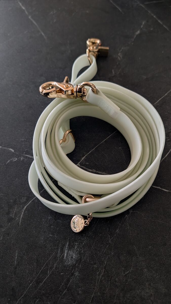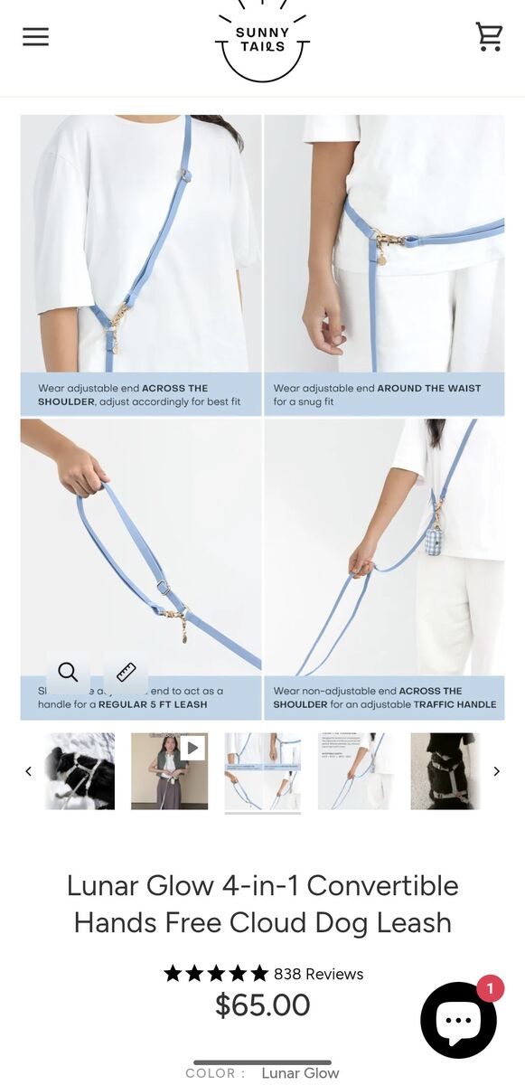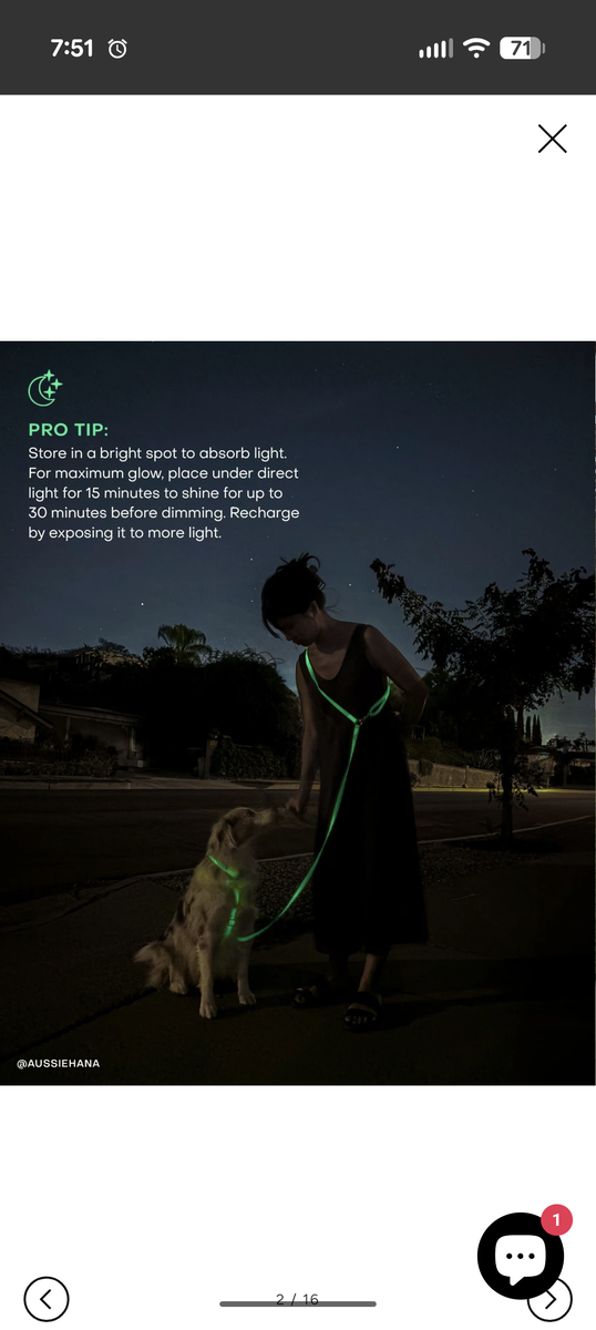 VenmoVersatile 4-in-1 Glow in the dark leas. Needs to be "charged" (exposed to a light source) at least 15 minutes before the walk to achieve the glow. Bought from sunny tails -see link below. Ot retails for $65, only asking for $40 since it was used a couple of times. https://shopsunnytails.com/products/lunar-glow-4-in-1-convertible-hands-free-cloud-dog-leash 8.5 FT fully extended Can be used 4 different ways - see pictures and on the website link above