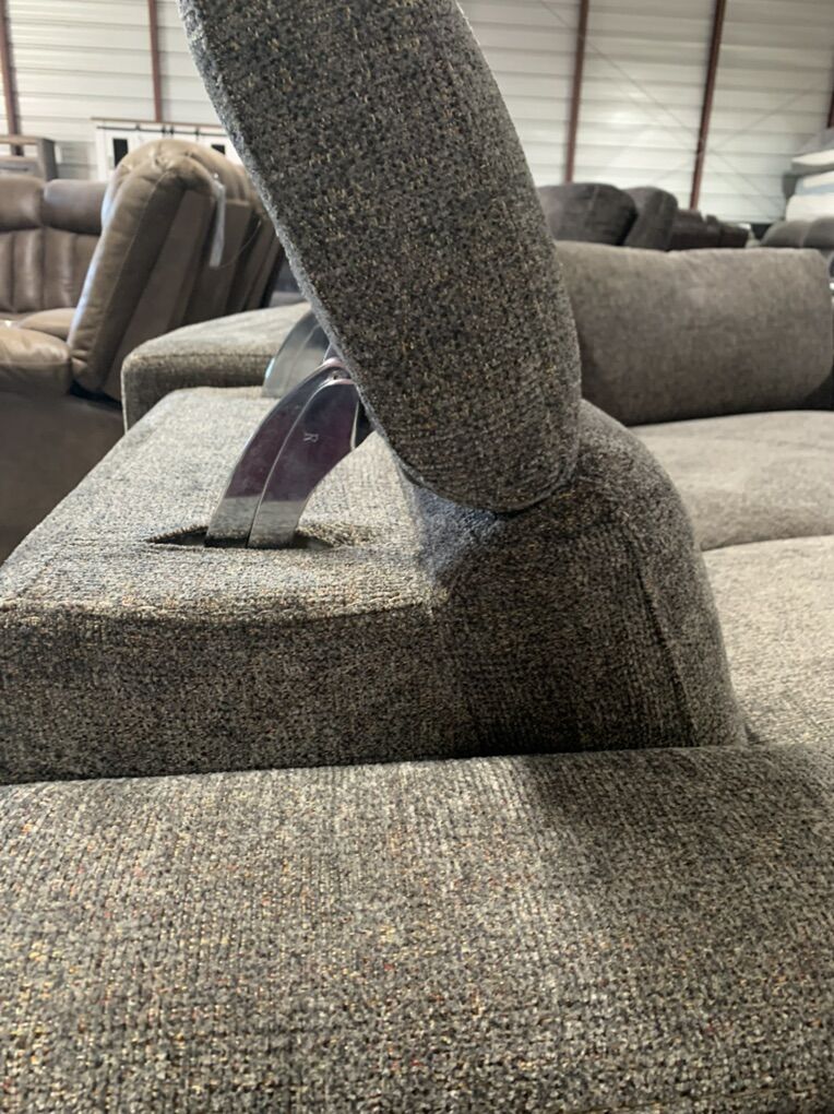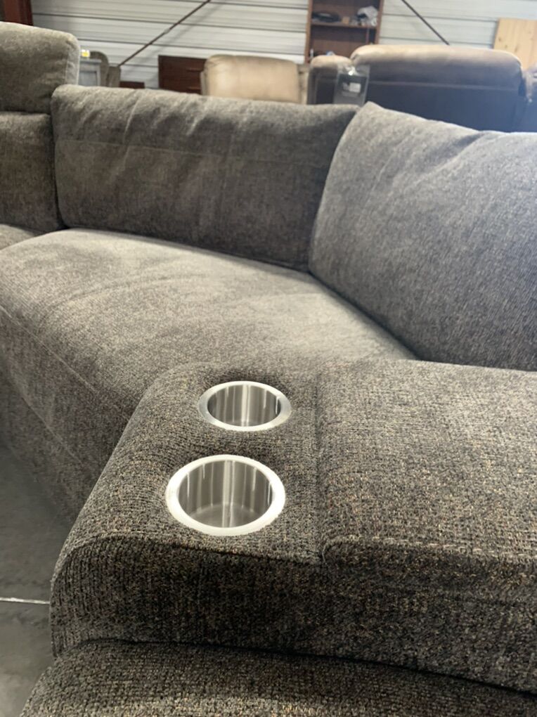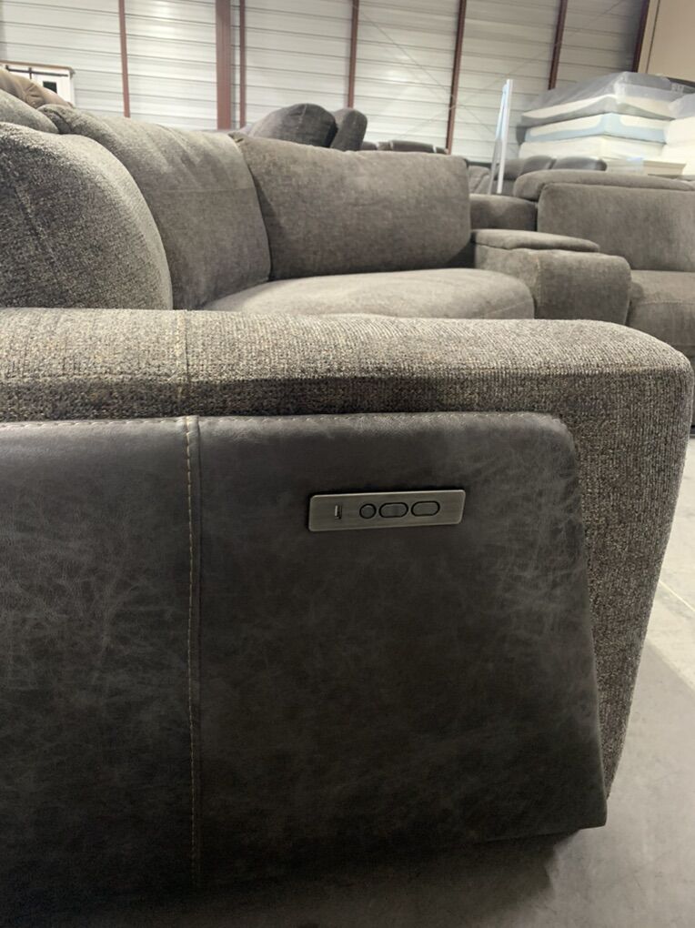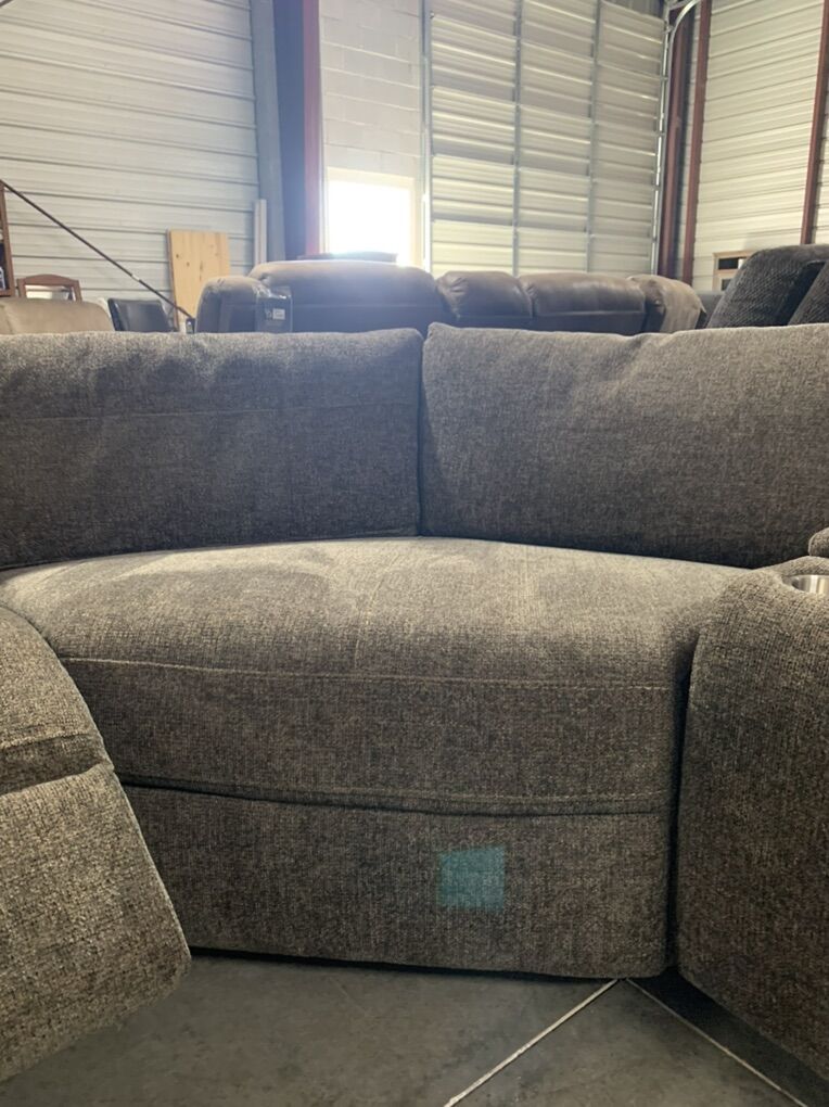 ApplePayThis sectional has all the bells and whistles. Three full powered seats for your ultimate choice in comfort. Reclines to an almost laying position. Head rests go up or folded down. USB ports. LED reading light (leave in or take out). Polyester chenille grey with colored specks fabric with grey contrasting fabric on sides. 6 piece sectional 3 powered chairs, oversized wedge,console with with cup holders. MEASUREMENTS: Sectional: 10x11 Height: 33 inches Depth: 39 inches seat depth: 31 Recliner Chair is an add on for $650
