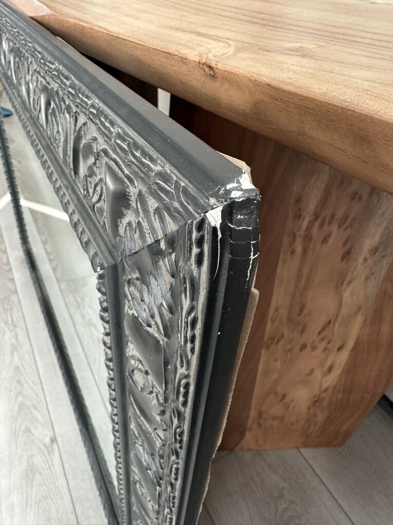 ZelleUsed antique black framed mirror which measures 32” x 44”. Moving company damaged frame corner as seen in image; however, mirror is not damaged. Some minor repair to the damaged corner and it’ll look great again.