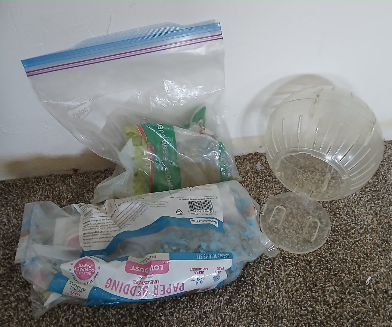 VenmoHairless Syrian hamster, named Daisy, with her hamster cage. The kids have moved on to other interests and she does not get much attention any more. We've had Daisy for about a year. Generally friendly, she has bitten a few times. Loves her Mazuri pellet food and any veggie scraps. Likes to run on her wheel and climb the bars of the cage. She is a curious hamster and will come out to see who's around. Some special care does need to be taken since she is hairless; we've provided her with extra rags and a little house for warmth. This hamster type cannot have babies because hairless hamsters can't lactate! The cage measures 17.25 inches tall x 33 inches wide x 18.5 inches deep. Bottom tray by itself is 6.25 inches tall. Top cage part unlatches for easy cleaning. Everything pictured is includes. Two doors. The front door opens easily and she may or may not be able to open it herself, which is why it's been zip tied. Comes with everything pictured, including a hamster ball, a little bit of bedding, a few hay cubes, and a #10 can full of Mazuri pellets. $95 for everything. Cash or venmo. Check out my other listings!