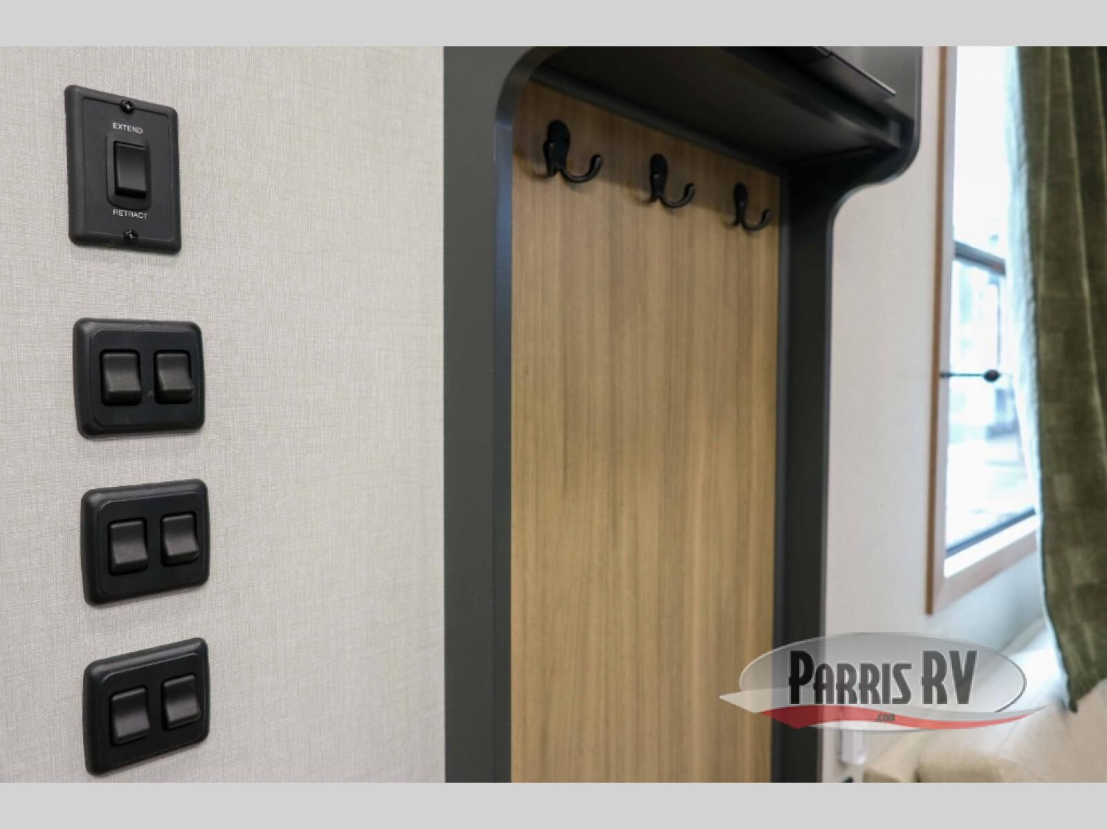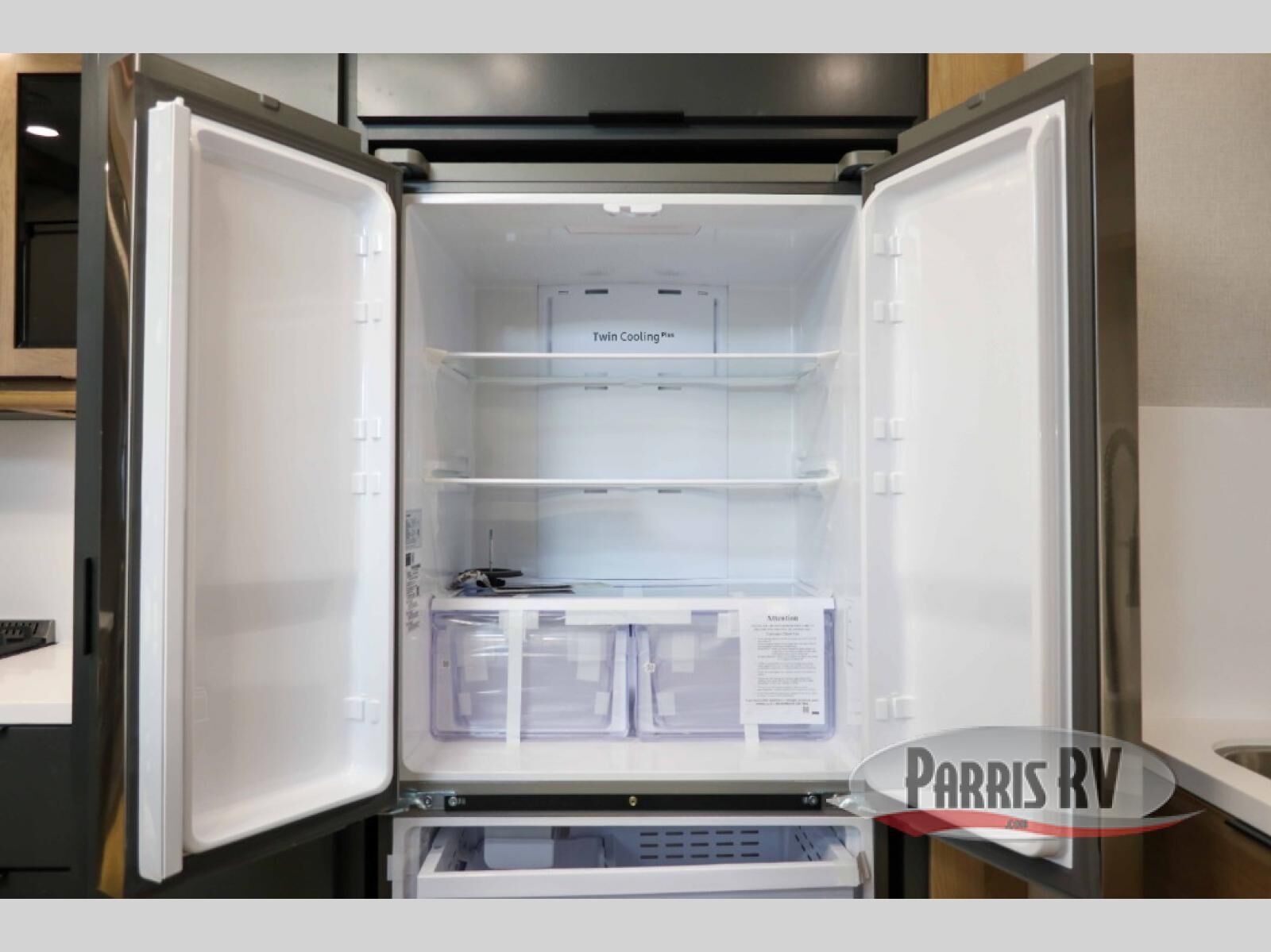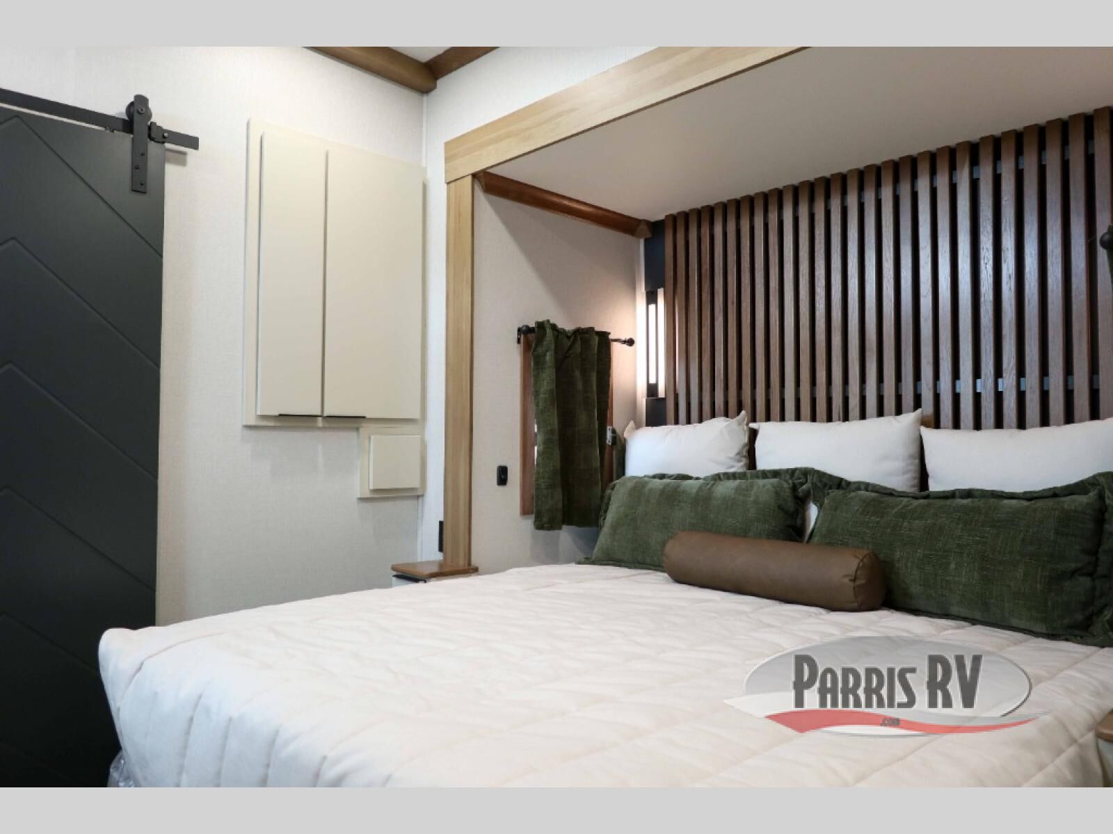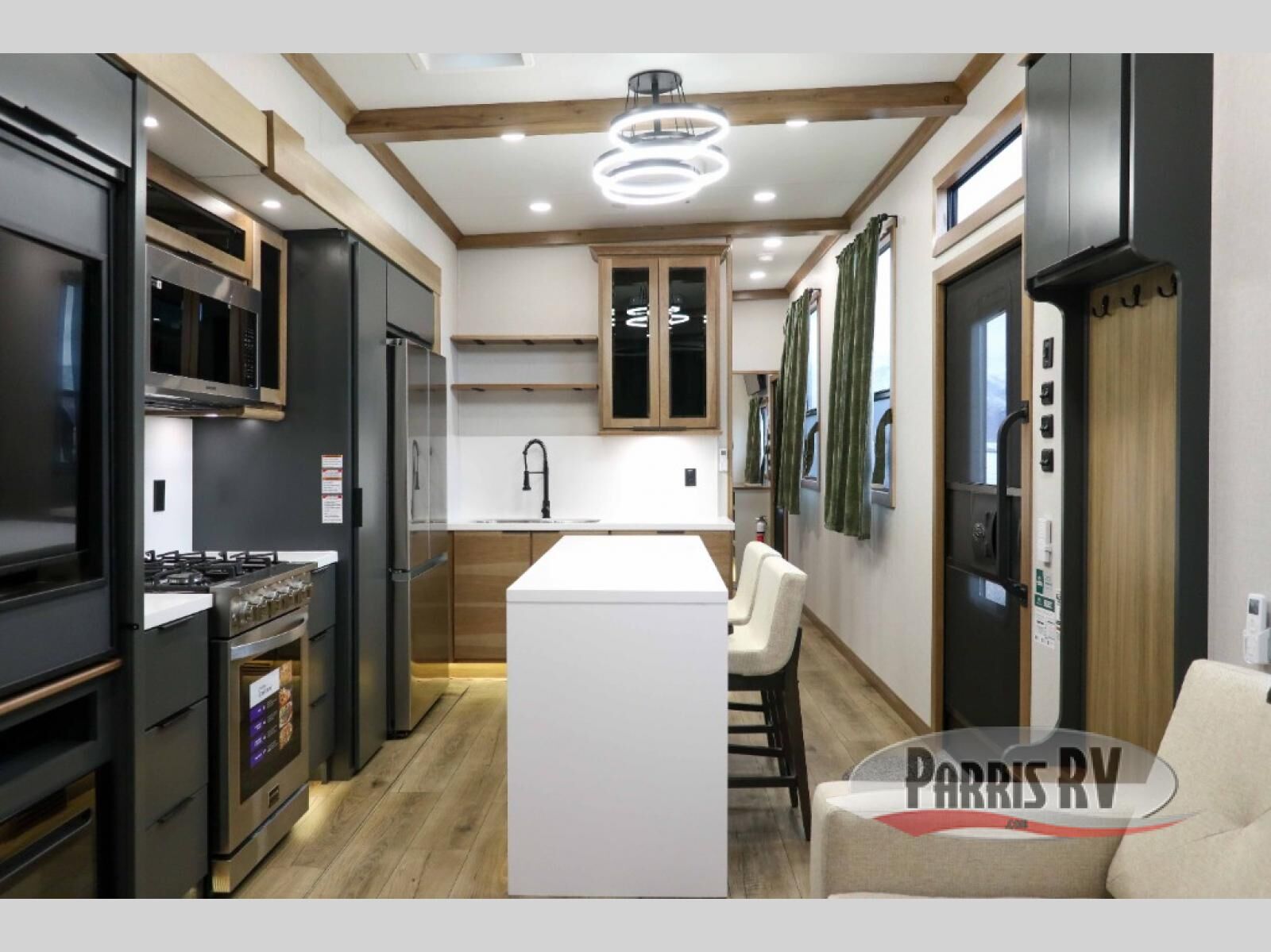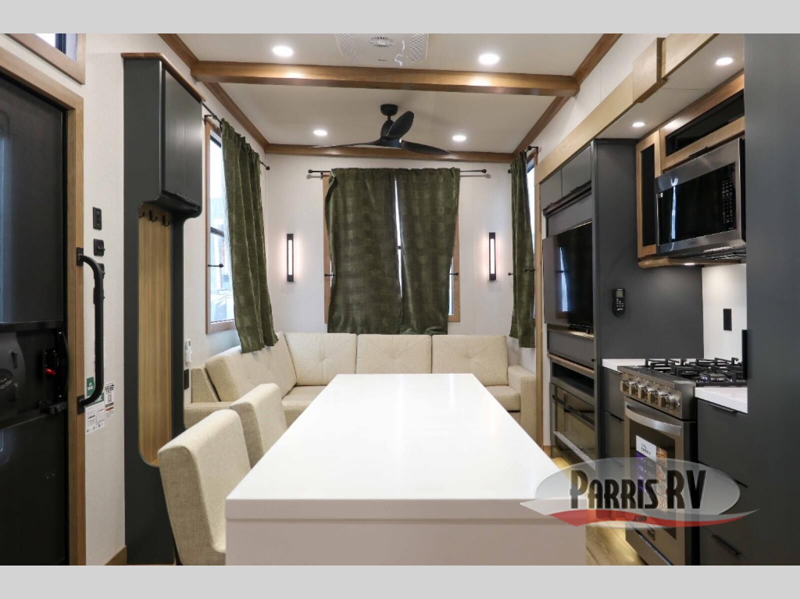 It won't be hard to find comfort in this dual slide, dual entry destination trailer! One of the entry doors conveniently opens to the front private bedroom where you'll find a queen bed slide out with a king bed option, dual closets with shelves in between, plus a dresser to keep everything tidy. If you have guests staying over, they can sleep on the L-shaped sleeper sofa in the rear living area, which is also directly across from the entertainment center for easy viewing. The chef of your group will love the spacious kitchen, complete with all the kitchen appliances to create their best meals and a large kitchen island with four chairs.