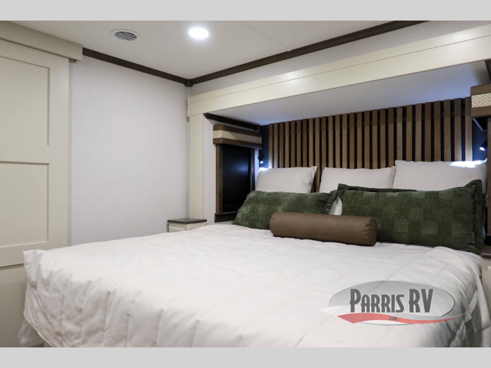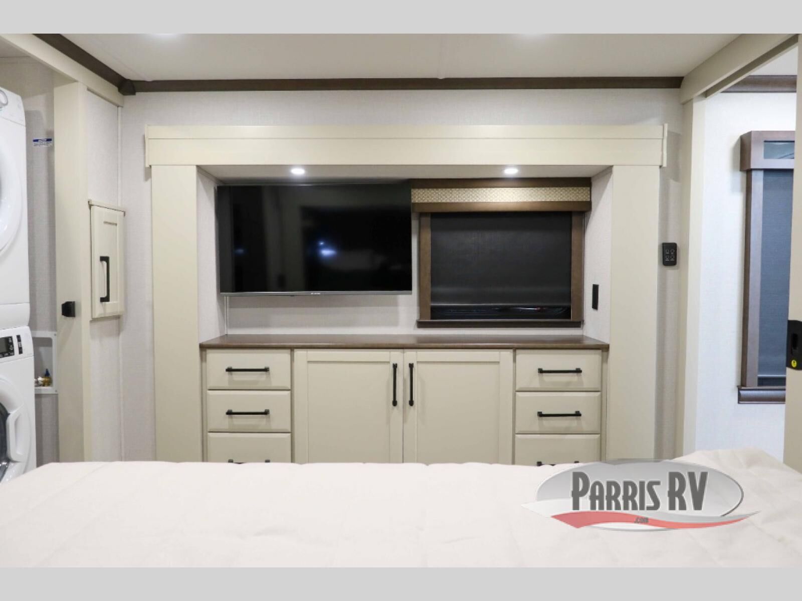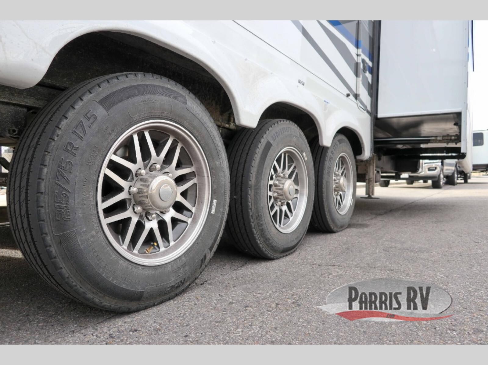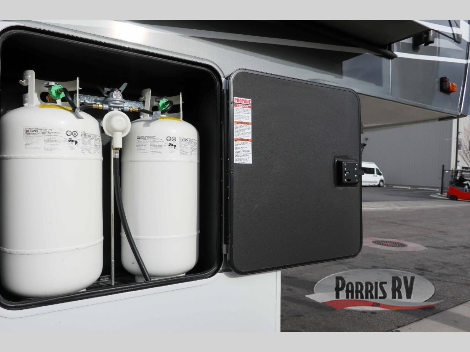 Step into luxury with this fifth wheel, where a high-end design, smart amenities, and functional living combine for an unmatched fifth wheel experience. As you enter you will find yourself in a spacious Kitchen for serious cooking: solid surface countertops, a full 18 cu. ft. french door refrigerator with ice maker, large stainless steel sink and residential-style faucet. Find yourself five slides that will create room for comfortable seating while you cozy up by the fireplace and watch your favorite movie or be as productive as you'd like with the slide out desk space. After a long day of travelling you will surely love to the front bedroom featuring a 72 x 80 king bed to finish your day with a good night's sleep.