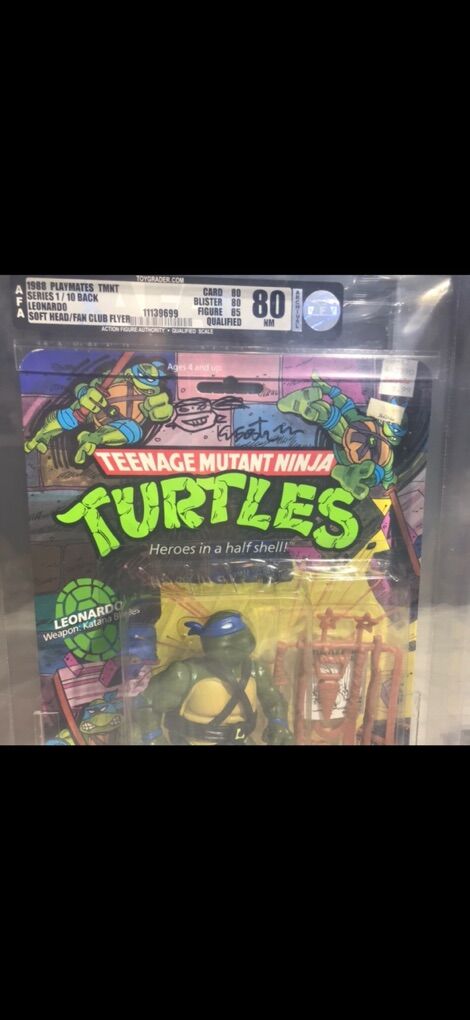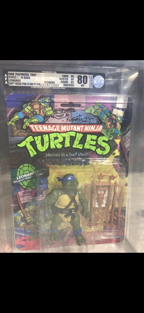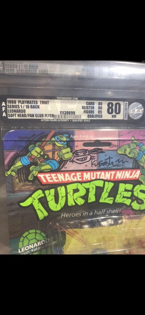 VenmoPlaymates TMNT Series 1 / 10 Back LEONARDO Soft Head / Fan Club Flyer Flyer AFA Graded 80NM. This is also signed by one of the creators of Ninja Turtles, Kevin Eastman.