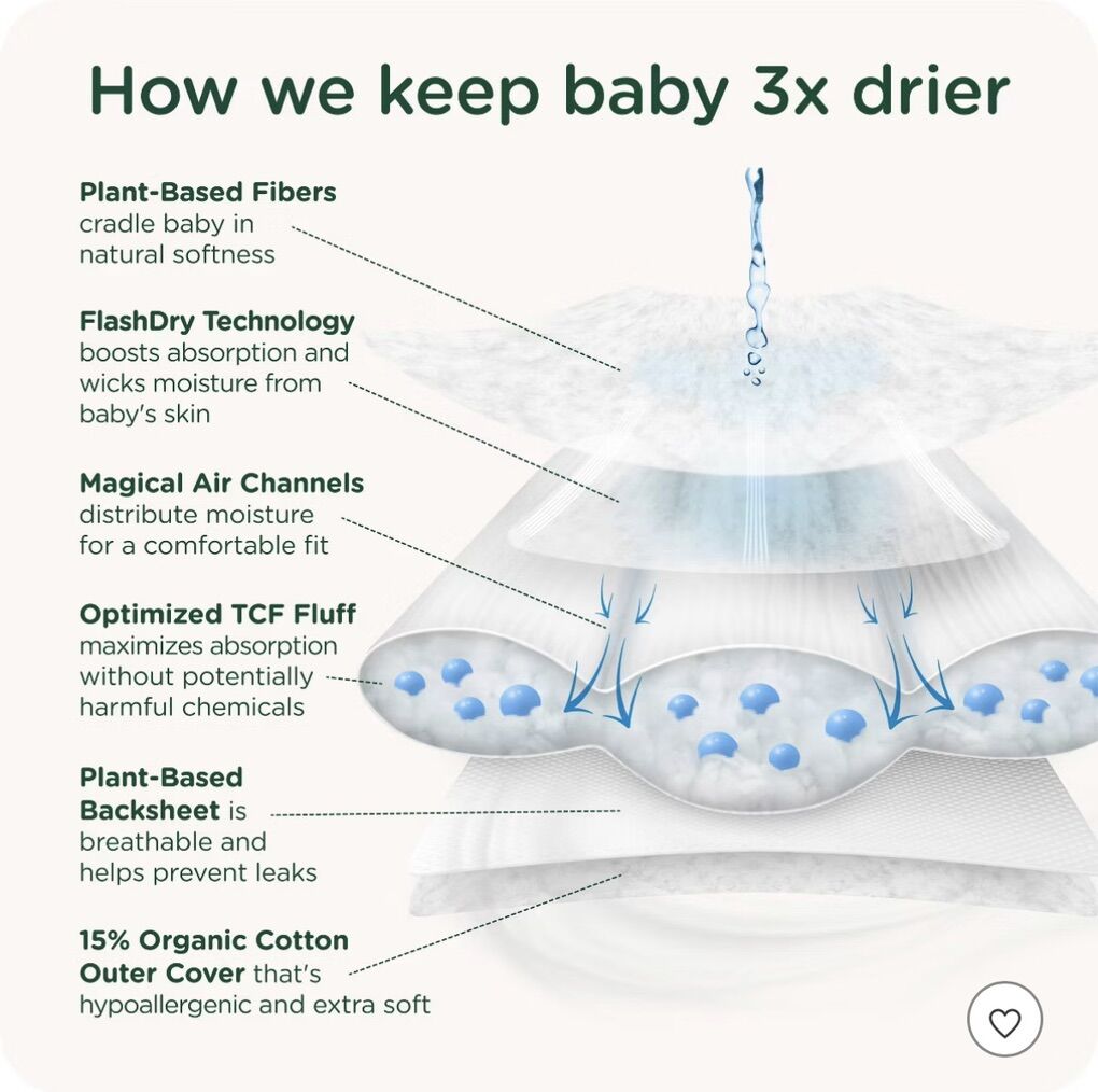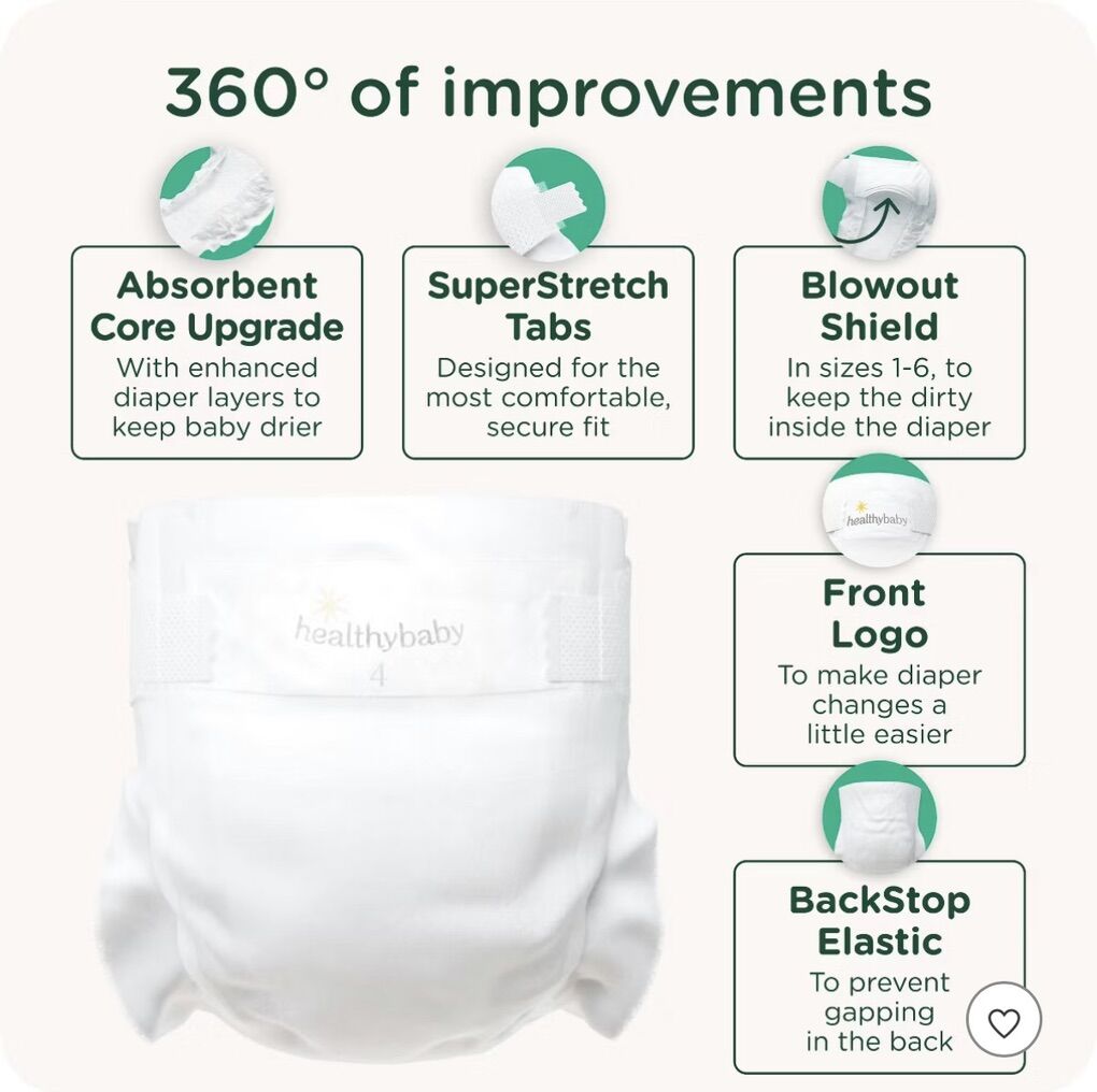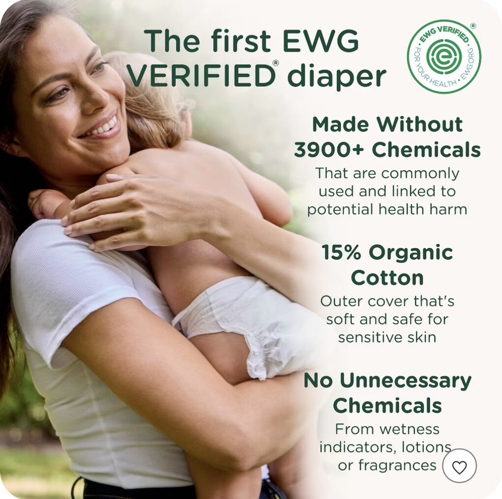 HealthyBaby Certified Safe Organic Cotton Enhanced Diapers - Size 5 - 44ct Only soft plant-based materials cradle baby's developing body No extra chemicals: no wetness indicator, no patterns Sustainable technology makes our diapers more absorbent with less waste Pioneer of the EWG VERIFIED™ safe diaper, independently evaluated by scientists and toxicologists at the Environmental Working Group (EWG) Made without 2800+ chemicals and materials linked to health harm under the EWG VERIFIED™ standard Enhanced with organic cotton* HealthyBaby is a Certified B-Corp, using business as a force for good Clean Air Channels lock away moisture in three-channel core system for happy skin and overnight leak protection