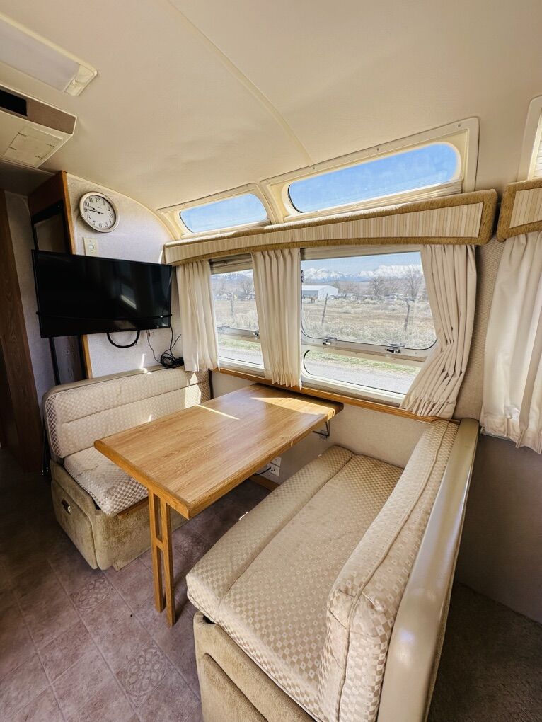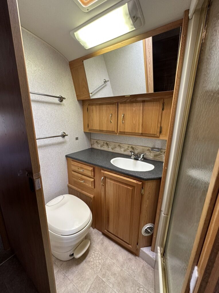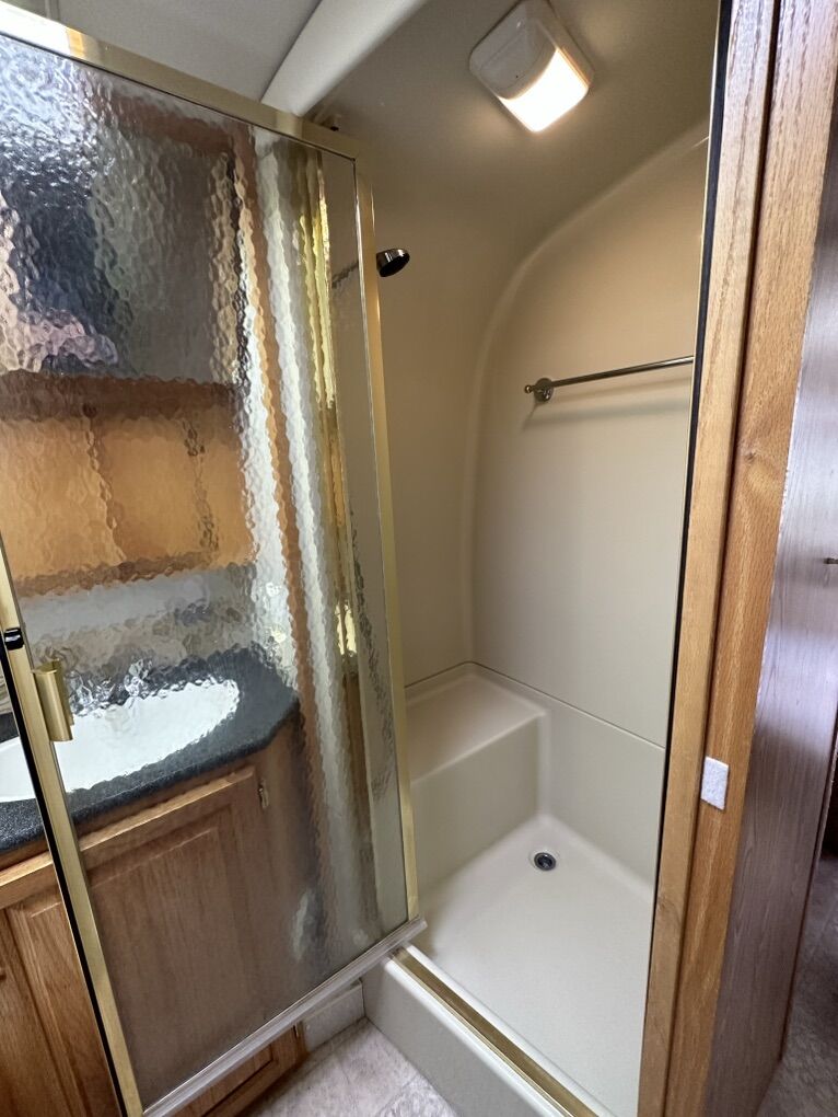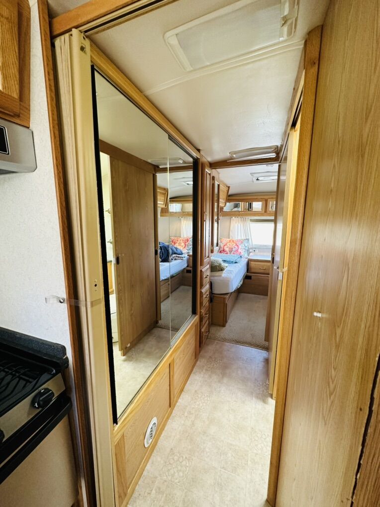 Fully loaded with new 3-way fridge that stays super cold, new oven/stove, convection microwave, smart TV, A/C, furnace, 2 fantastic fans, water heater that keeps plenty of water hot for a long shower, huge closet, radio, cd changer, dvd player and wired for satellite, but never used. Newer tires with plenty of life and the bearings were repacked recently. Equalizer hitch included. It is stored under cover when not in use.