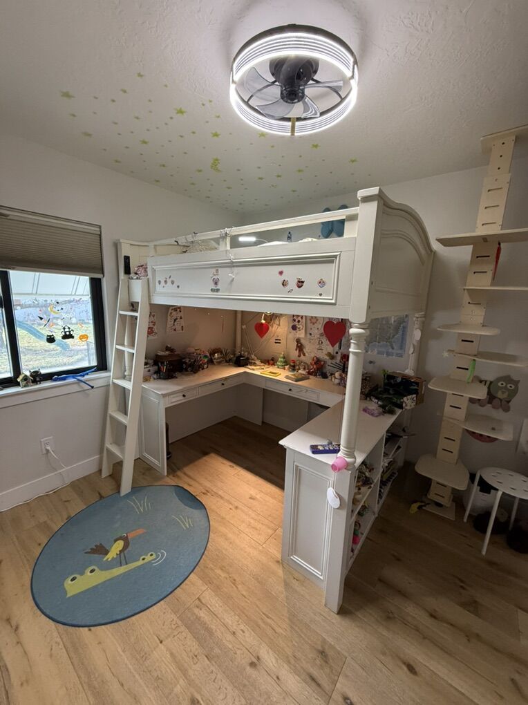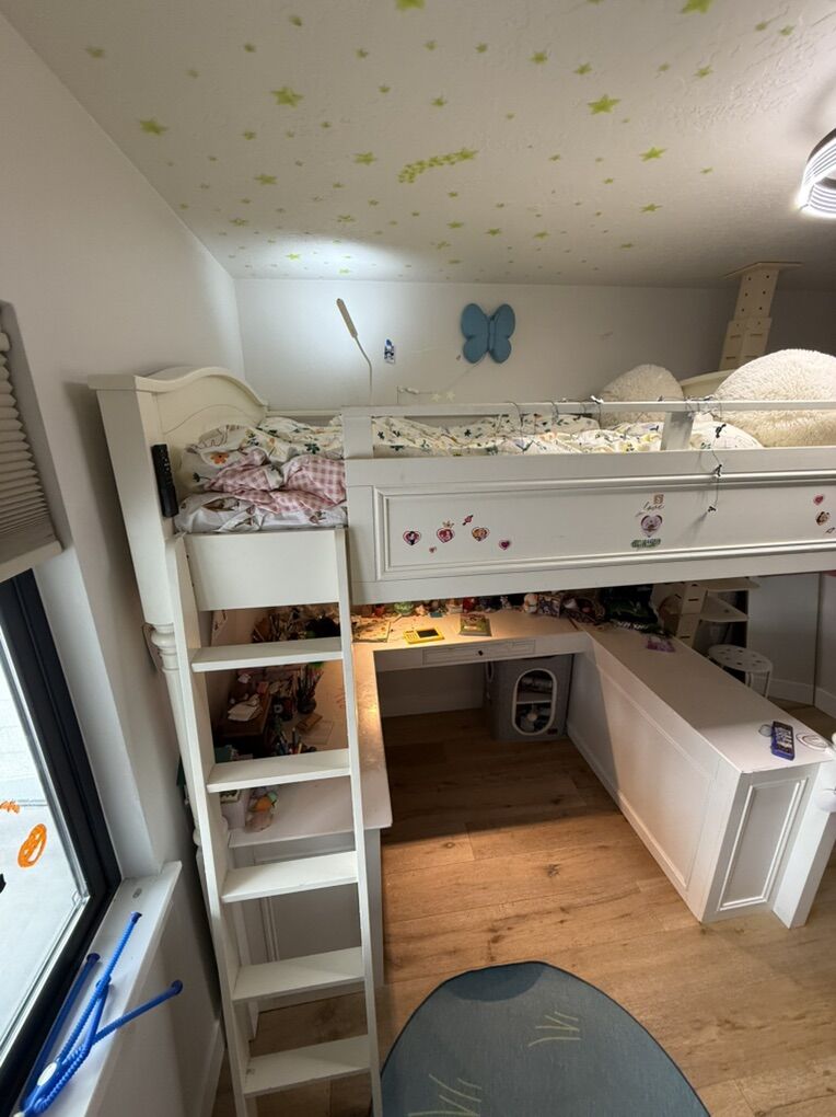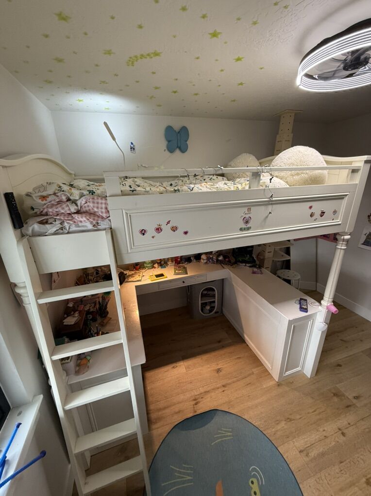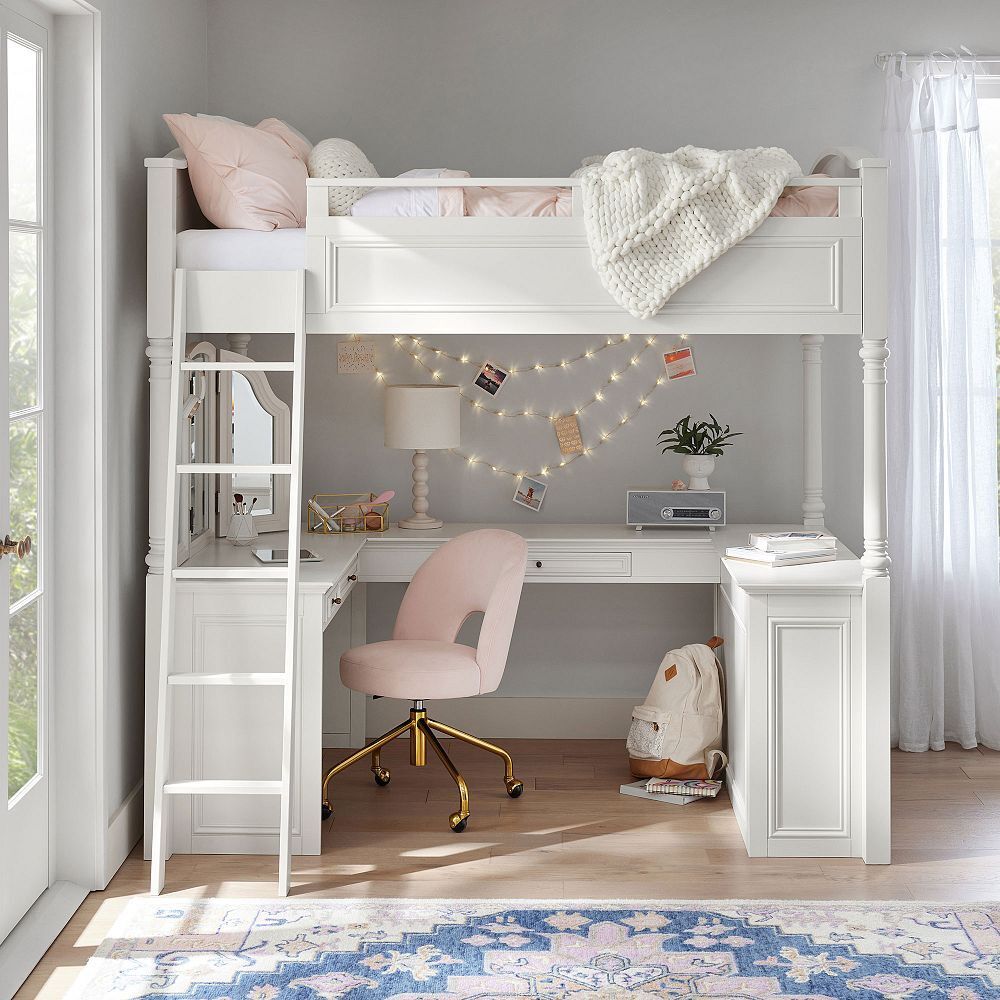 VenmoBeautifully built with style and functionality in mind, this unique setup lets you sleep, study and store your essentials in one place. Featuring a vanity with three beveled mirrors, this all-in-one system is complete with six deep drawers so you can keep your clothes organized. UL GREENGUARD Certified to contribute to healthier indoor air, keeping you and your family safer. Crafted from hardwoods, MDF and quality veneers. Features a Simply White finish with drawer pulls finished in antique brass. Detailed with with molding-framed drawers and large bun feet. Requires a full-size mattress do not use box spring on loft bed. Due to the height of mattress restrictions, recommended maximum mattress height: 7.5. Dovetailed drawers feature bottom mounted drawer glides. Desk is equipped with a flip-down keyboard tray; the bookcase features four-cubbies. Ladder can be assembled to attach to either end of the bed. Loft was designed for use in room with 8' ceilings. Make sure you include ceiling fans and hanging fixtures when measuring.