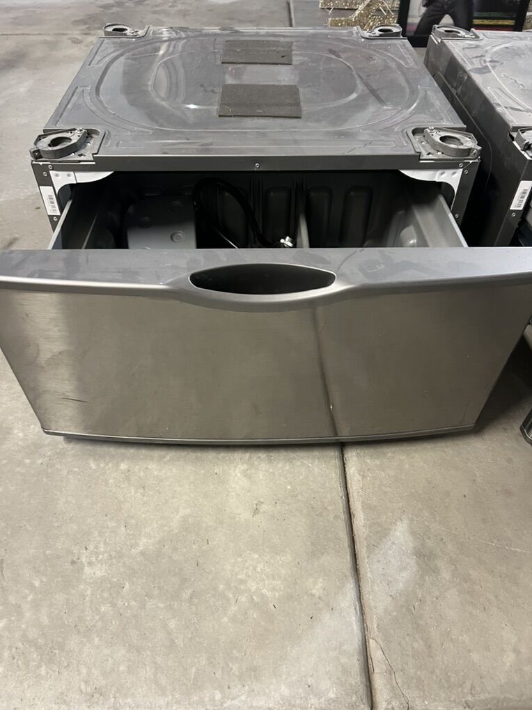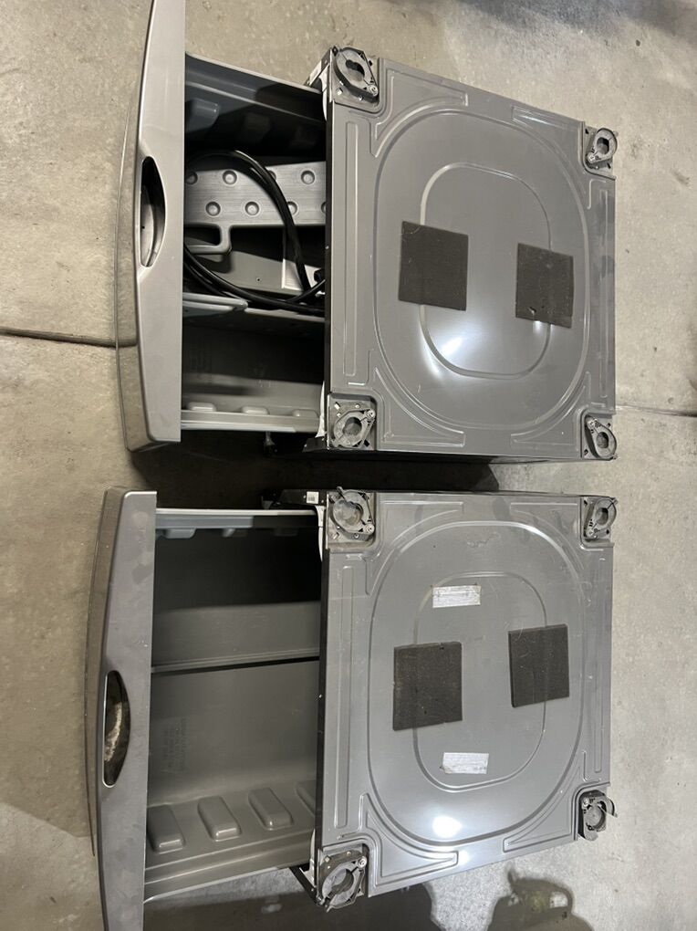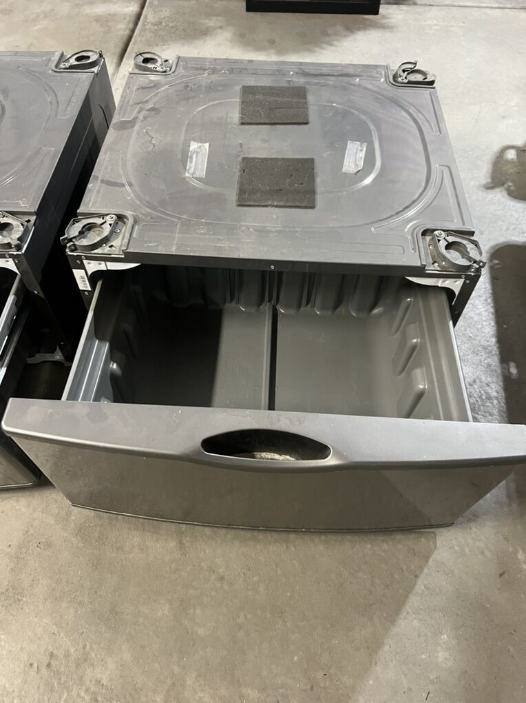 Two grey (with stainless steel accents) washer/dryer risers with drawer storage. Sold as a set $40
