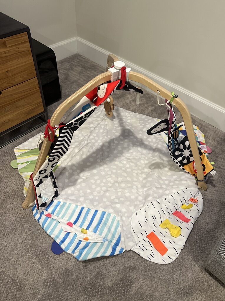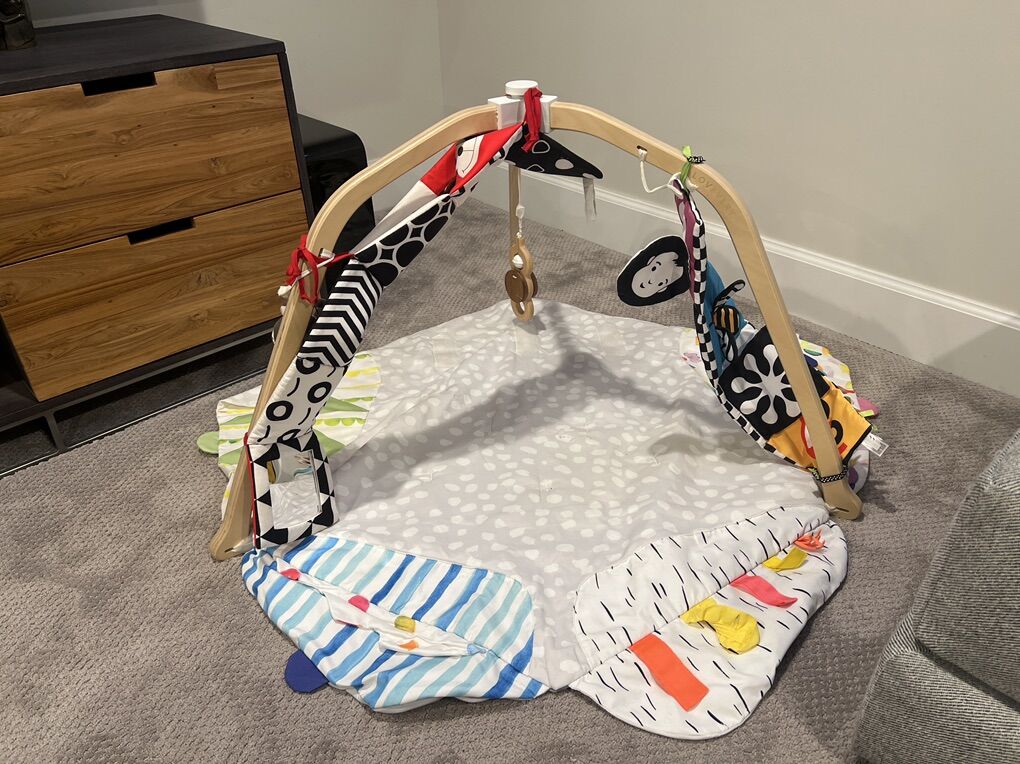 The mat is easily machine washable. All accessories shown are yours if you want them. A great playmat for babies under a year.
