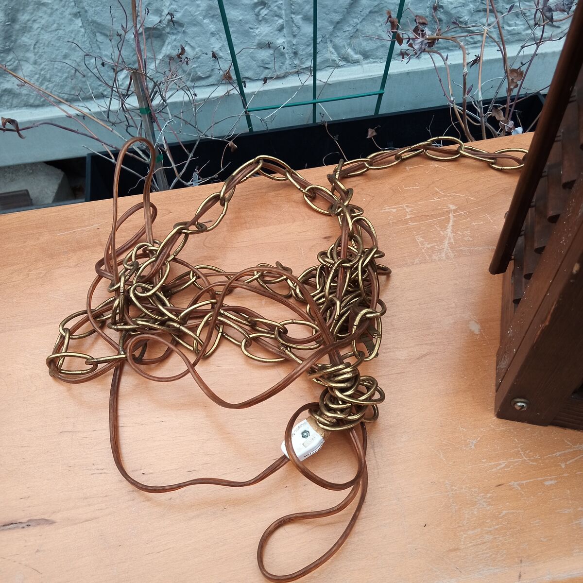 MCM wooden swag lamp, I think from the 1970's, and I think it's pine stained to look like walnut