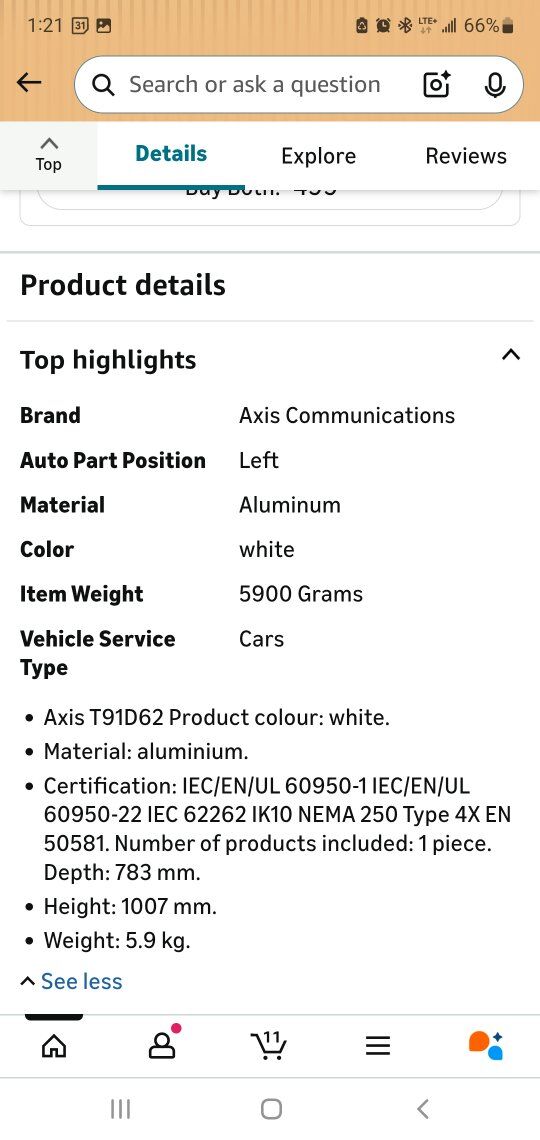 BrandAxis Communications Auto Part PositionLeft MaterialAluminum Colorwhite Item Weight5900 Grams Vehicle Service TypeCars Axis T91D62 Product colour: white. Material: aluminium. Certification: IEC/EN/UL 60950-1 IEC/EN/UL 60950-22 IEC 62262 IK10 NEMA 250 Type 4X EN 50581. Number of products included: 1 piece. Depth: 783 mm. Height: 1007 mm. Weight: 5.9 kg.