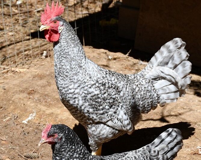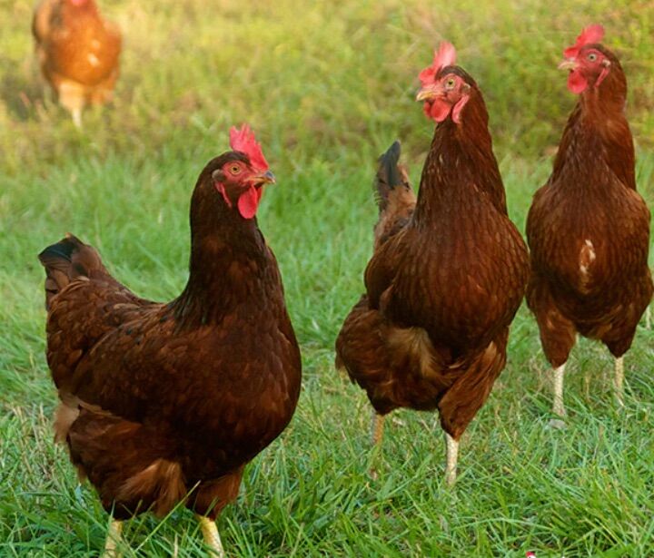 (Red birds that resemble Rhode Island Reds with white feather tips and blotches. Chicks can be sexed at hatch — males hatch yellow, females hatch red.)