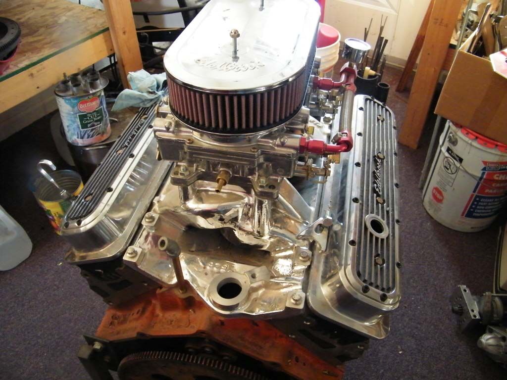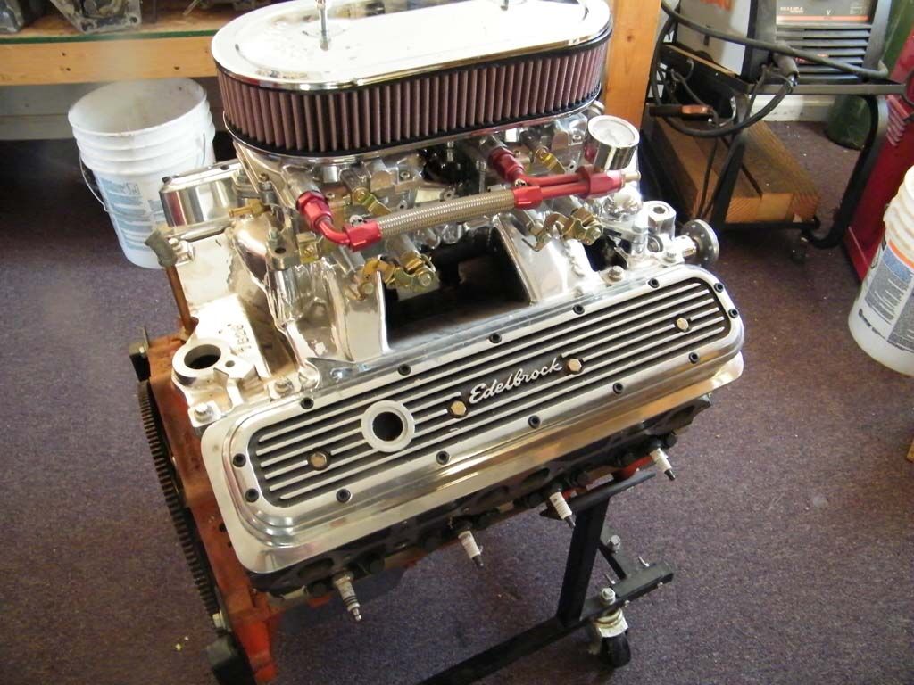 This 350 engine has never been run - new vortec heads, twin 4 barrel carbs, roller rockers, lots of chrome, hi-lift cam, bored 30 over, balanced, finned valve covers, misc extras - ready for a custom show car.