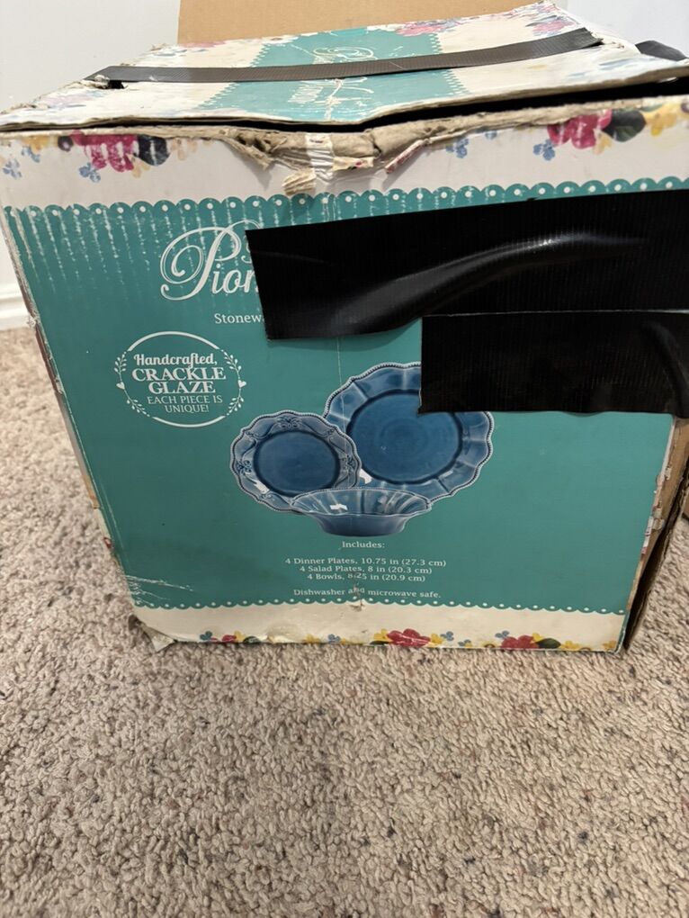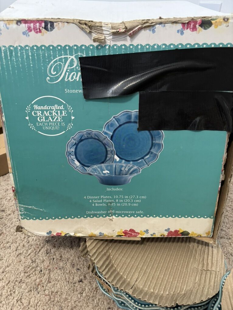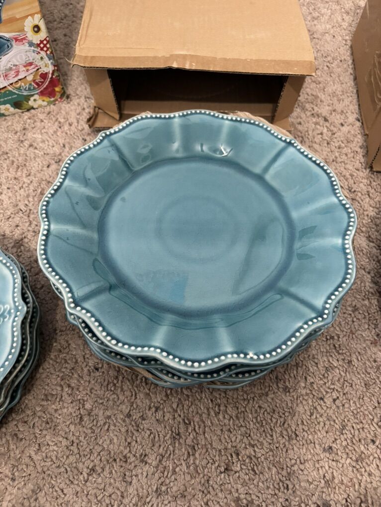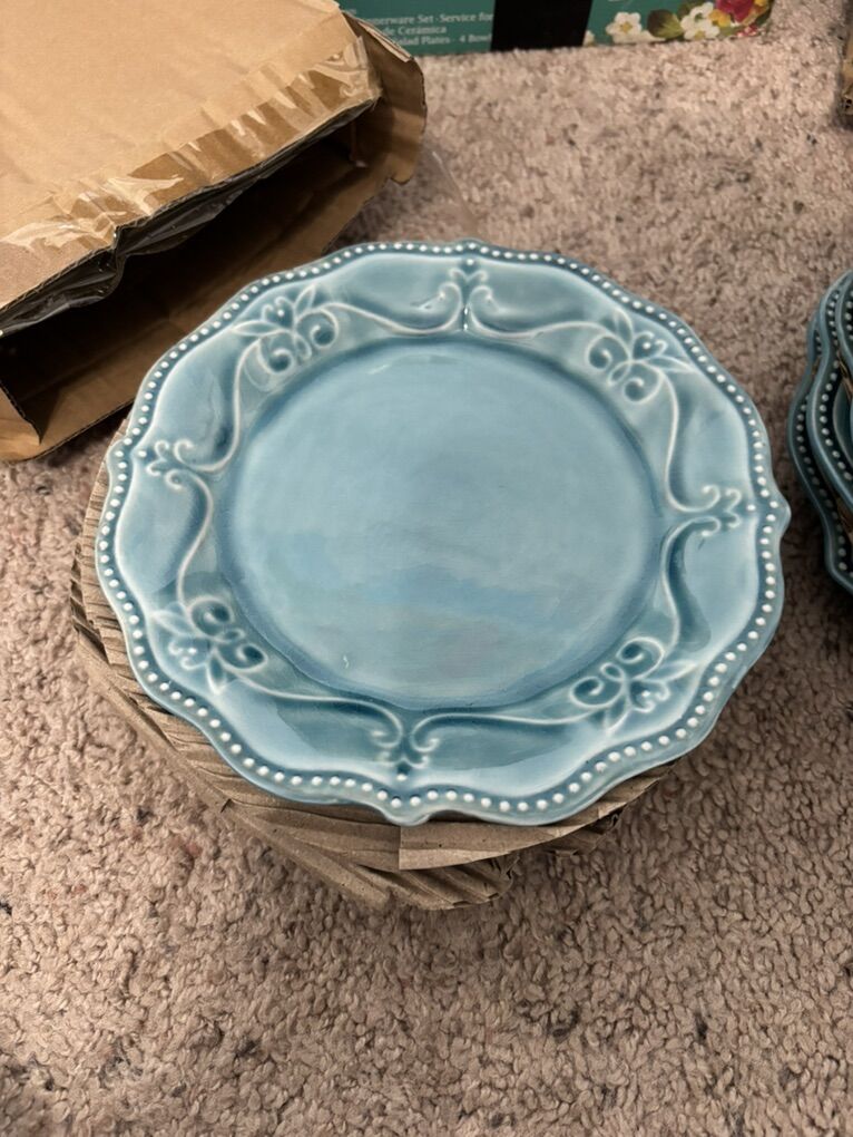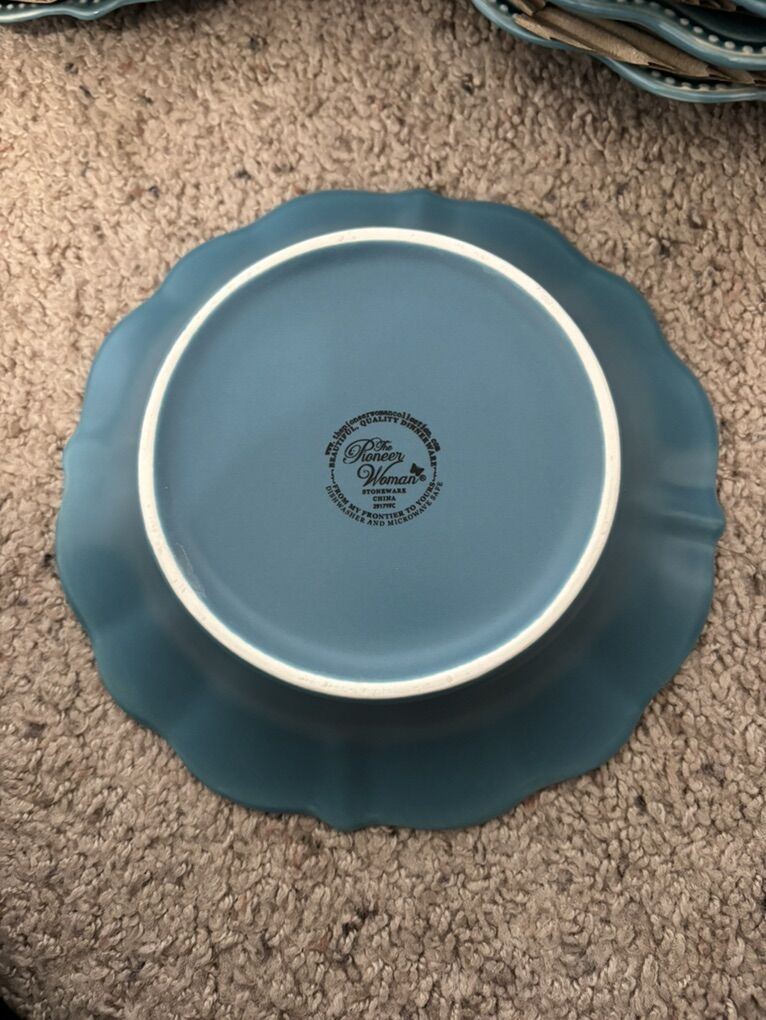 The Pioneer Woman Paige 12-Piece Dinnerware Set, Denim Plates Bowl Kitchen White Beaded Rims Handcrafted Crackle Glaze 4 Dinner Plates, 10.75” 4 Salad Plates, 8” 4 Bowls, 8.25” Dishwasher and microwave safe. No advance payment Payment and pick up are at the same time.