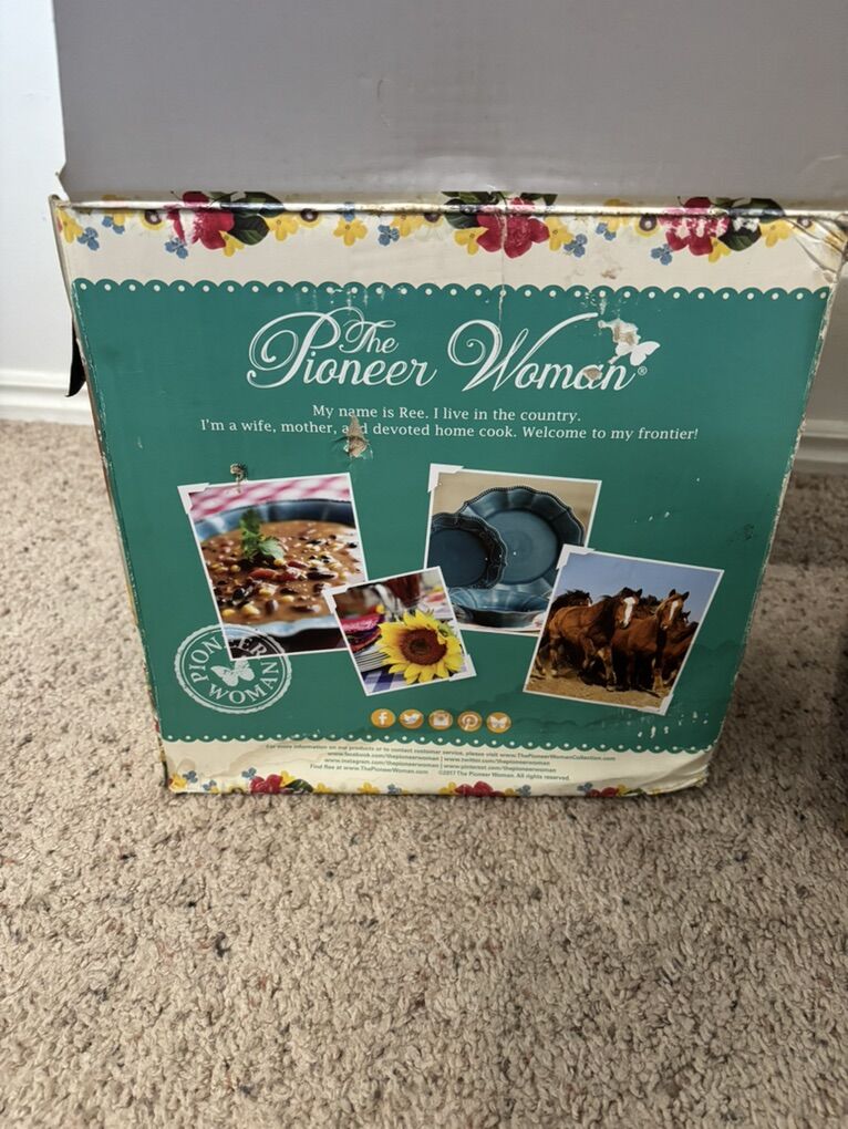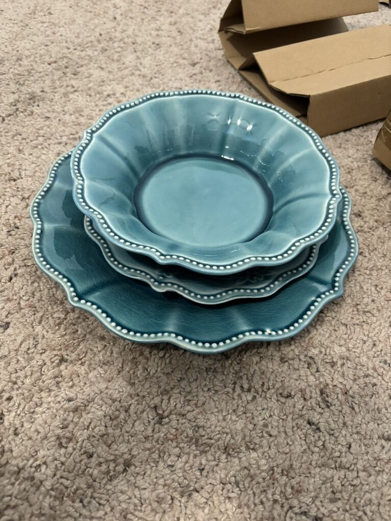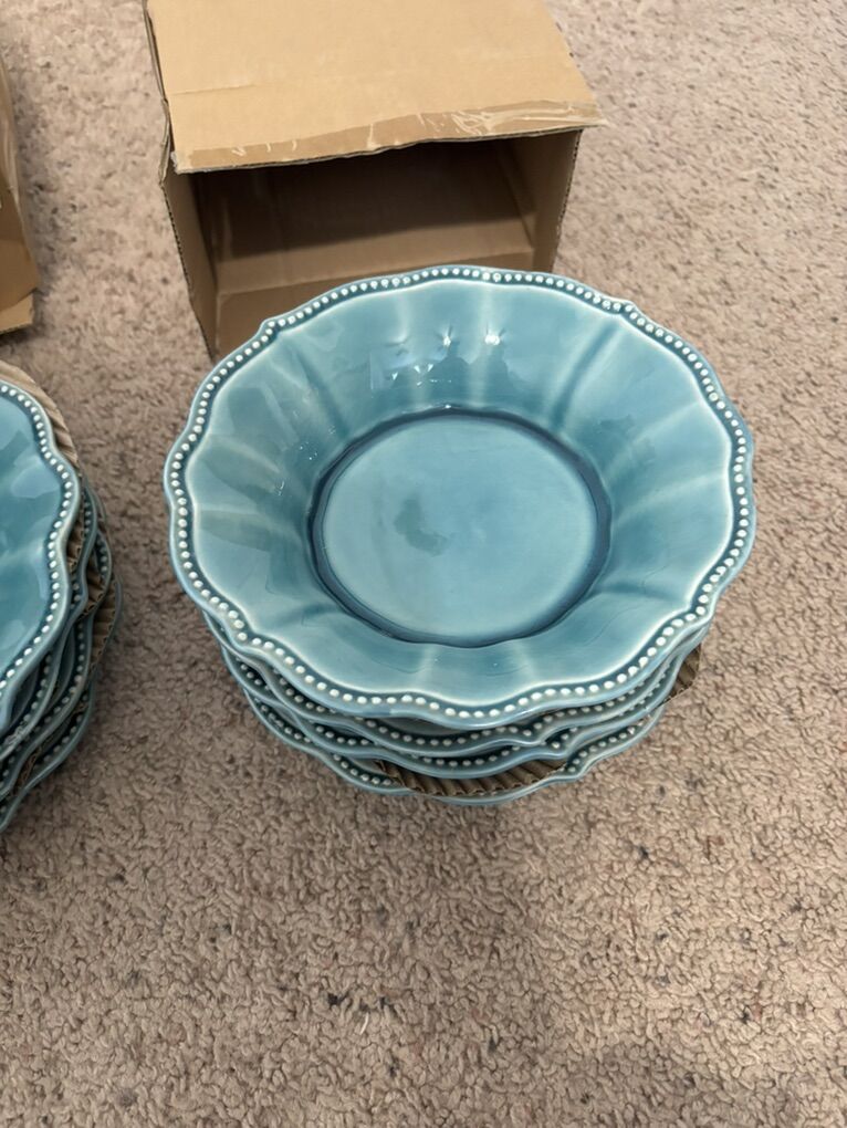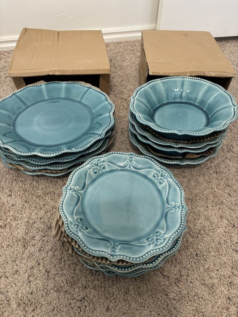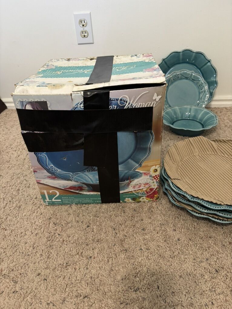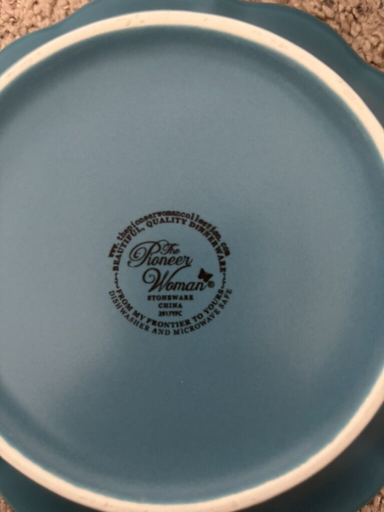 The Pioneer Woman Paige 12-Piece Dinnerware Set, Denim Plates Bowl Kitchen White Beaded Rims Handcrafted Crackle Glaze 4 Dinner Plates, 10.75” 4 Salad Plates, 8” 4 Bowls, 8.25” Dishwasher and microwave safe. No advance payment Payment and pick up are at the same time.