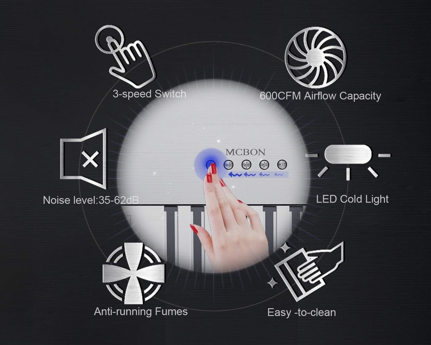 600 CFM SUCTION POWER Effective copper motor offers powerful suction Quickly removes oil fumes and harmful carcinogens Reduces the damage to your skin and health