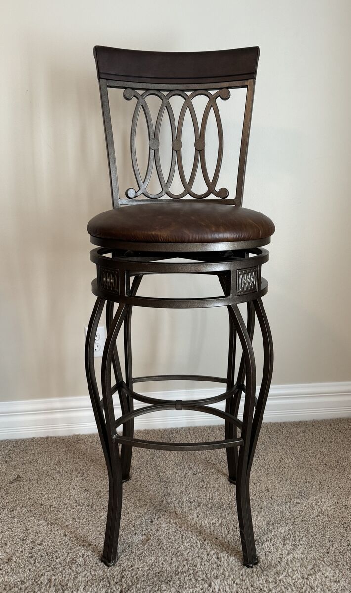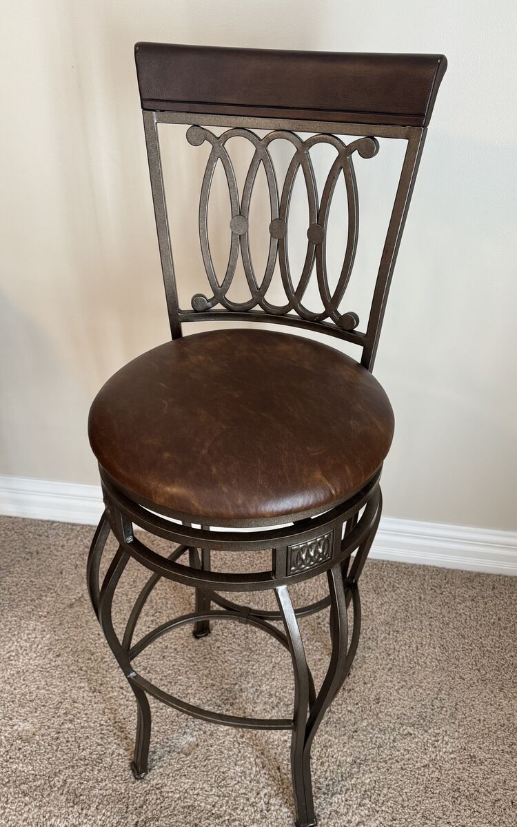 We have 3 bar stools for sale. These are very nice bar stools with metal frames and brown leather or Faux leather seats. The seats swivel as well. Ornate metal and high backs for back support. SEATS are approximately 32"-33" in height. Overall height to top of seat back is 48". Will not respond to are they still available messages.