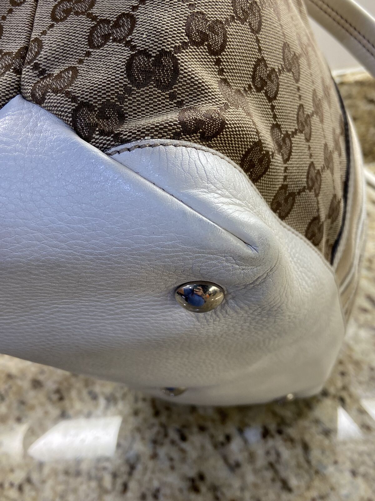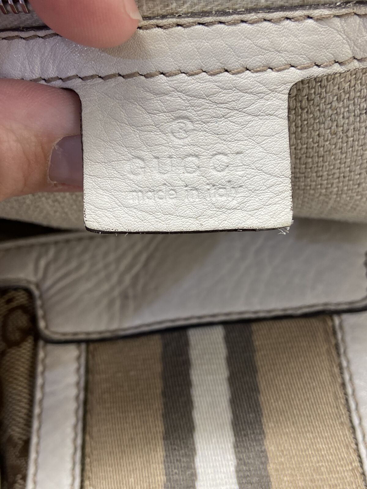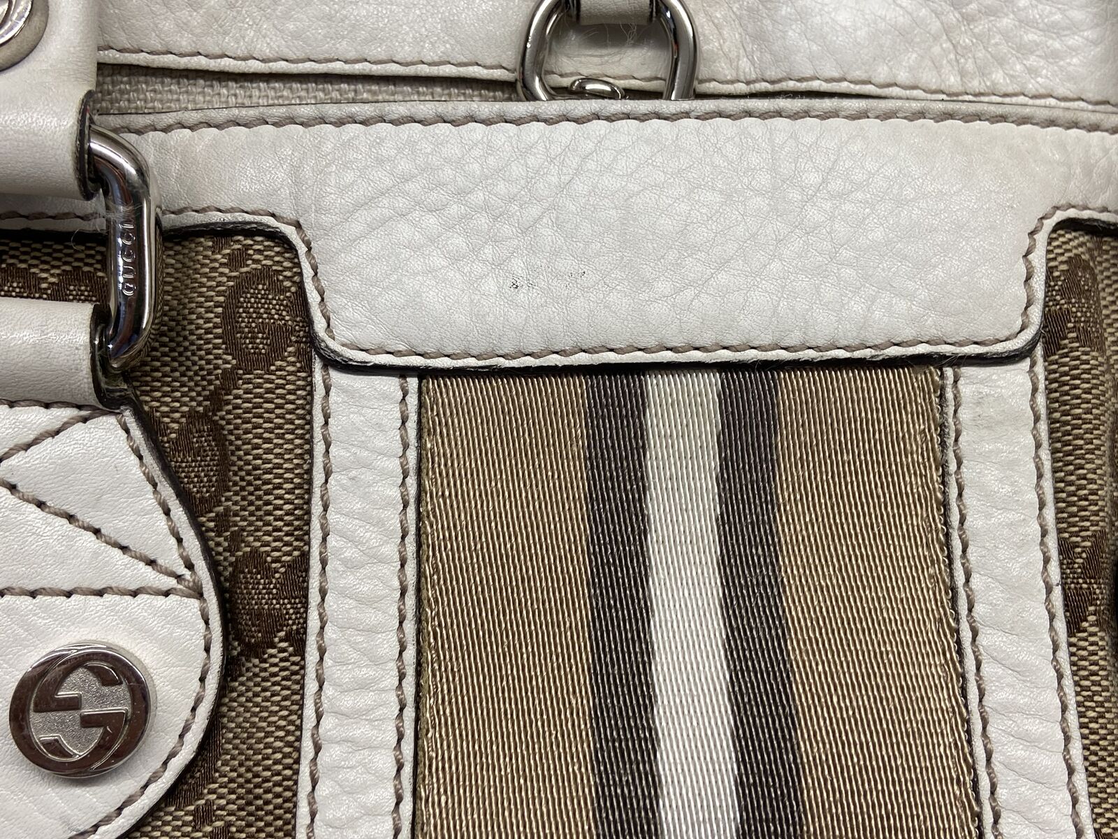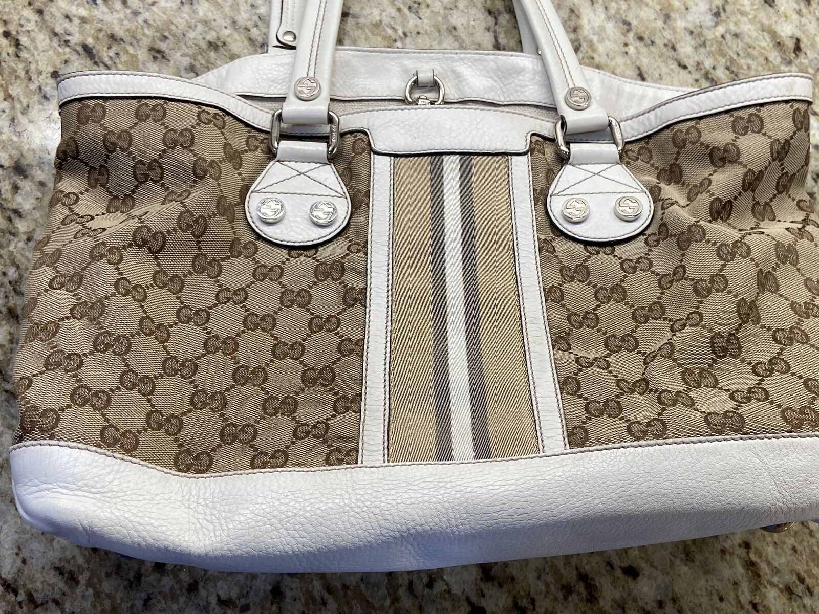 ApplePayAuthentic Gucci canvas and white leather tote bag. This bag is in good condition. Clean inaide and out, no smell and cracking. The call out is 2 minor small holes in the canvas on each of the bag but other than that the bag is in good condition. Will come with a COA