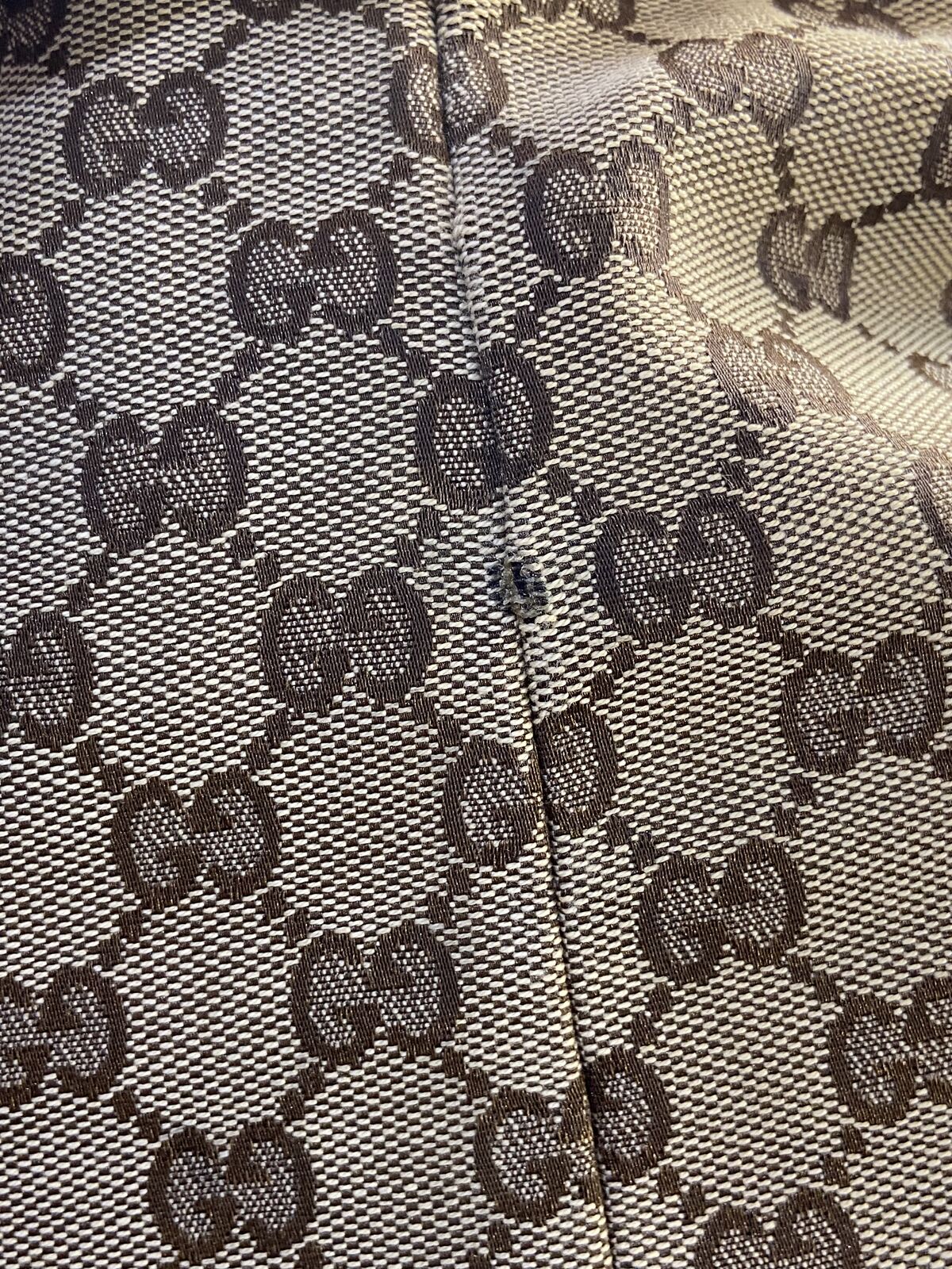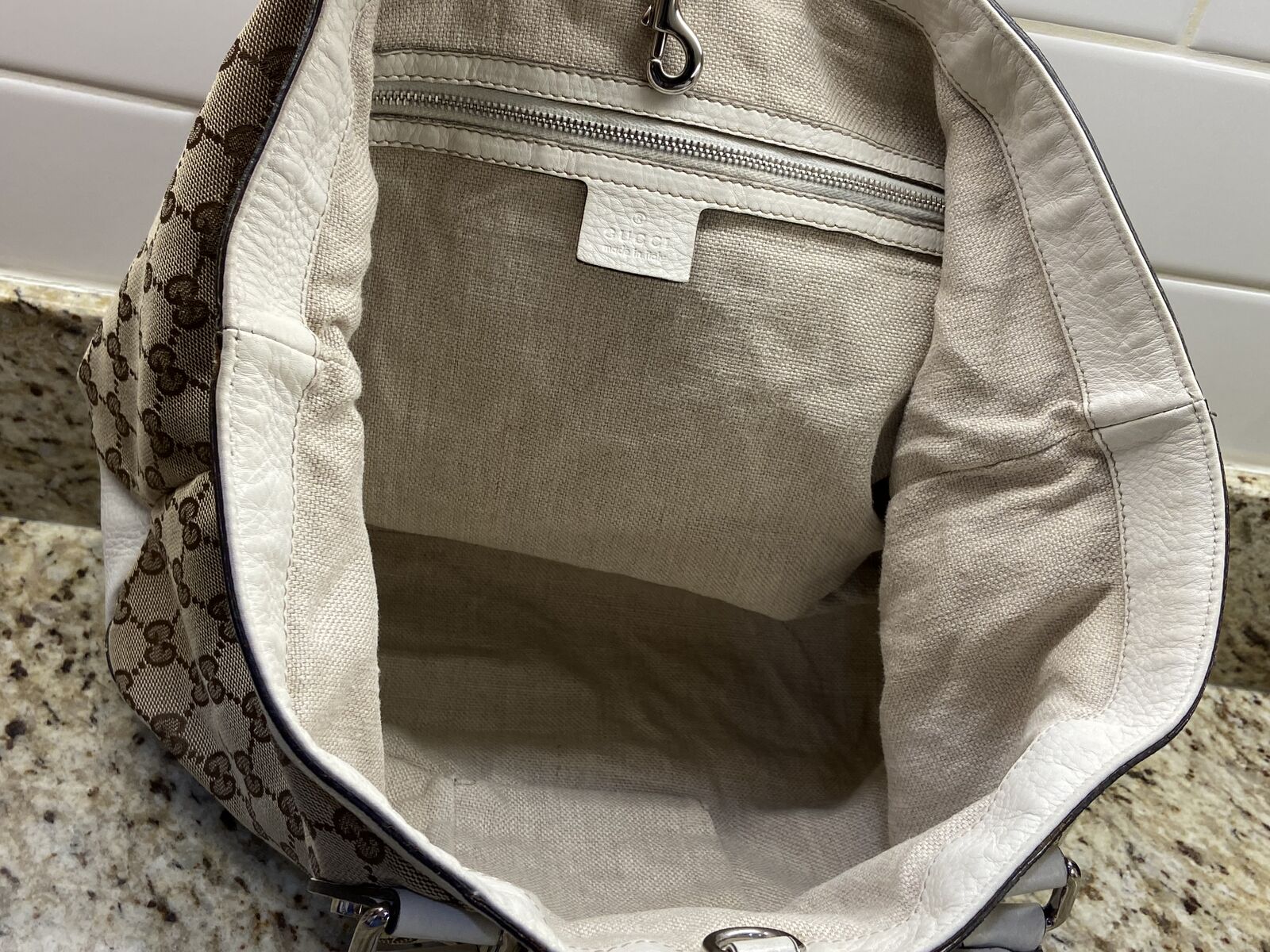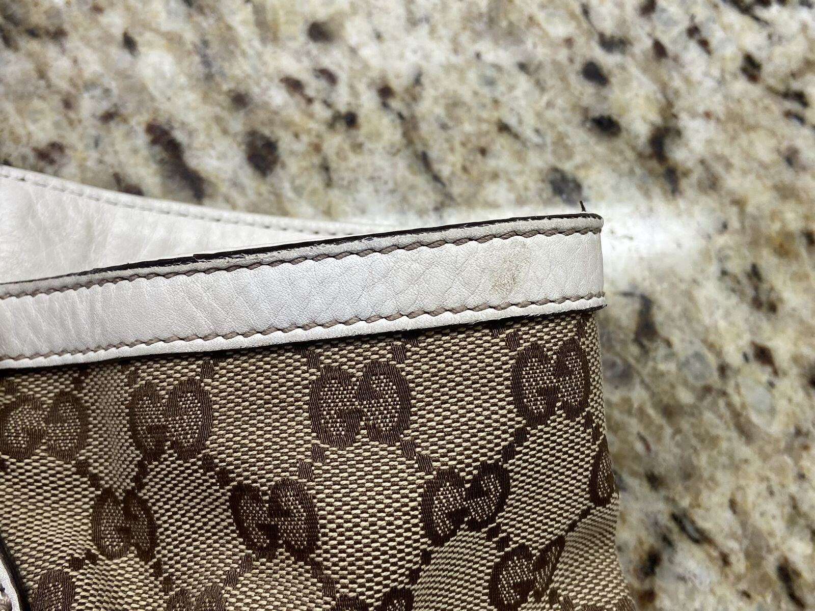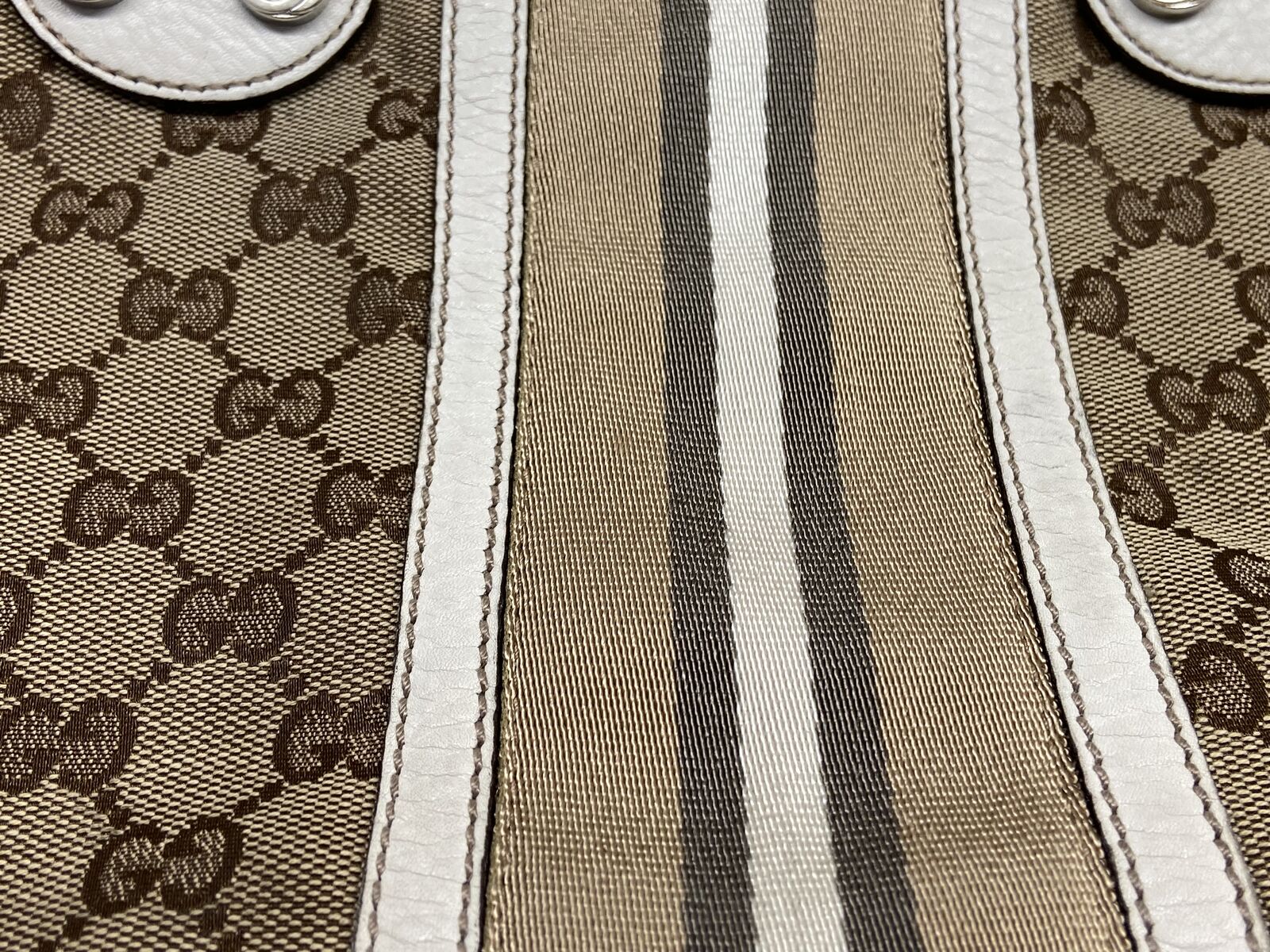 ApplePayAuthentic Gucci canvas and white leather tote bag. This bag is in good condition. Clean inaide and out, no smell and cracking. The call out is 2 minor small holes in the canvas on each of the bag but other than that the bag is in good condition. Will come with a COA