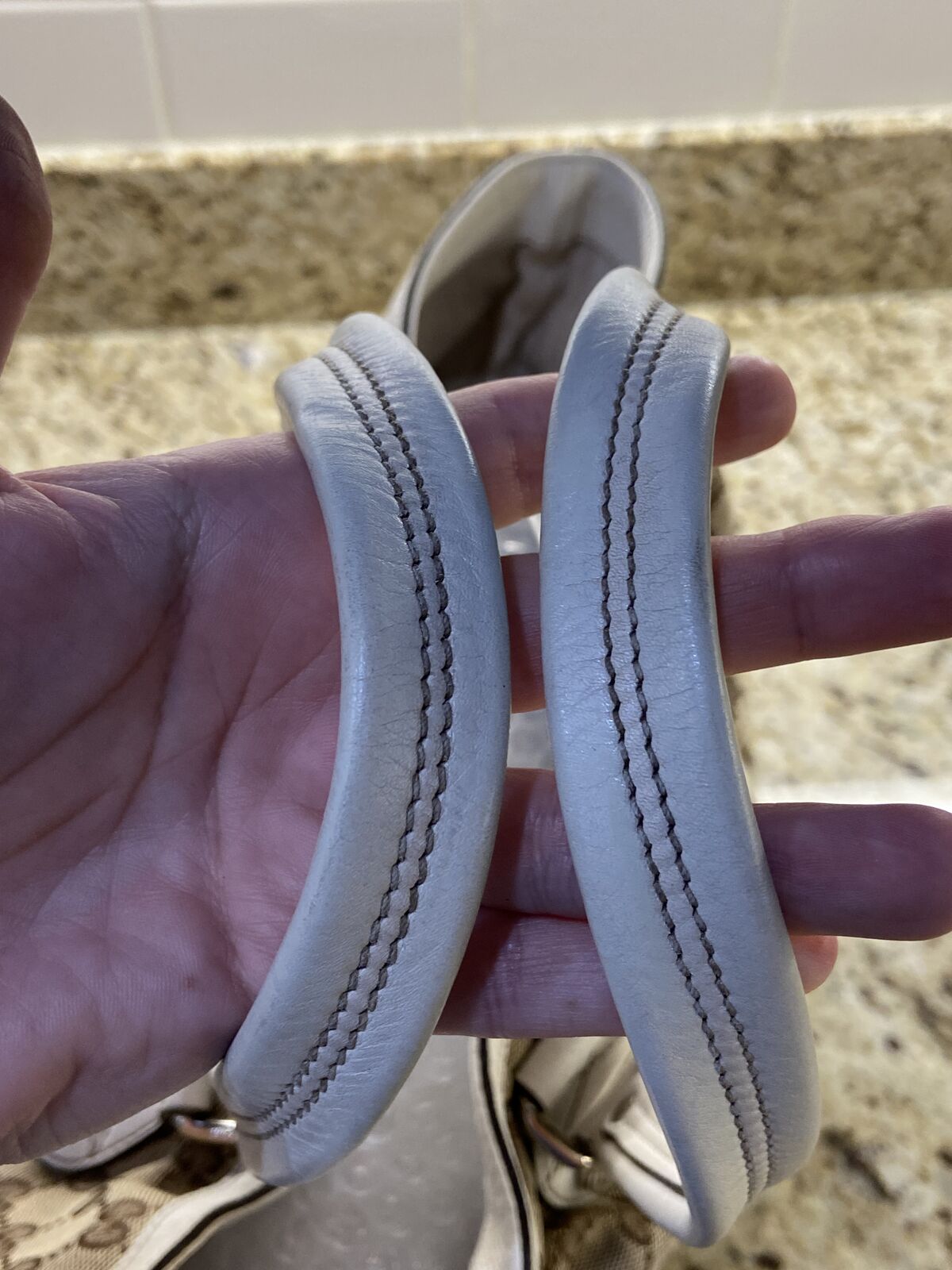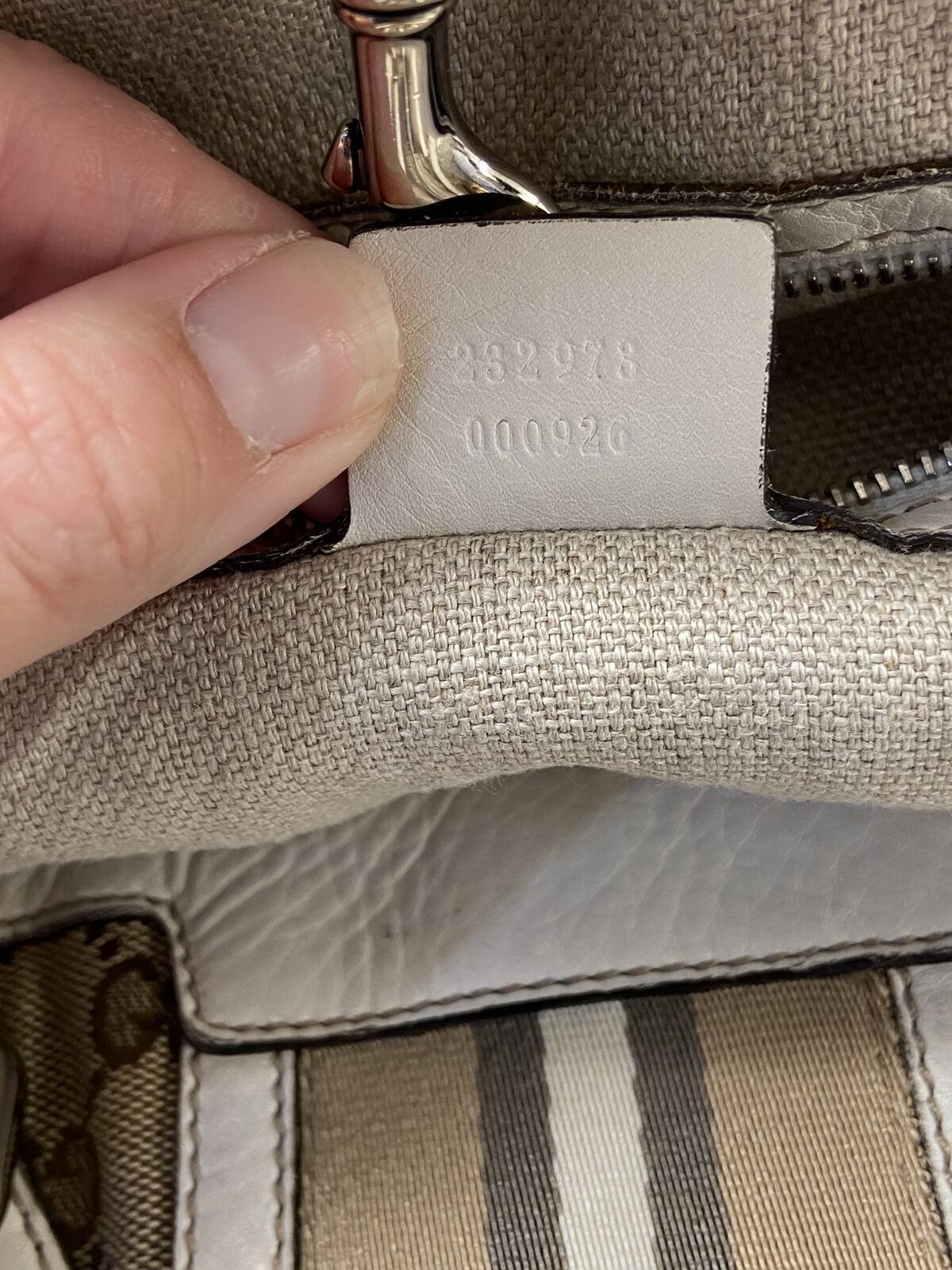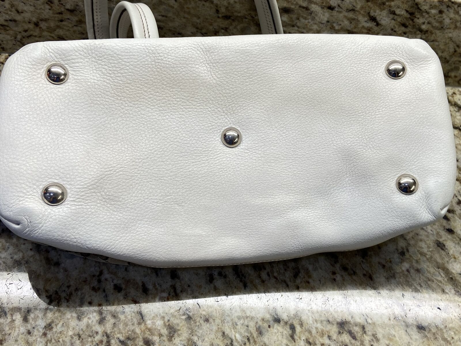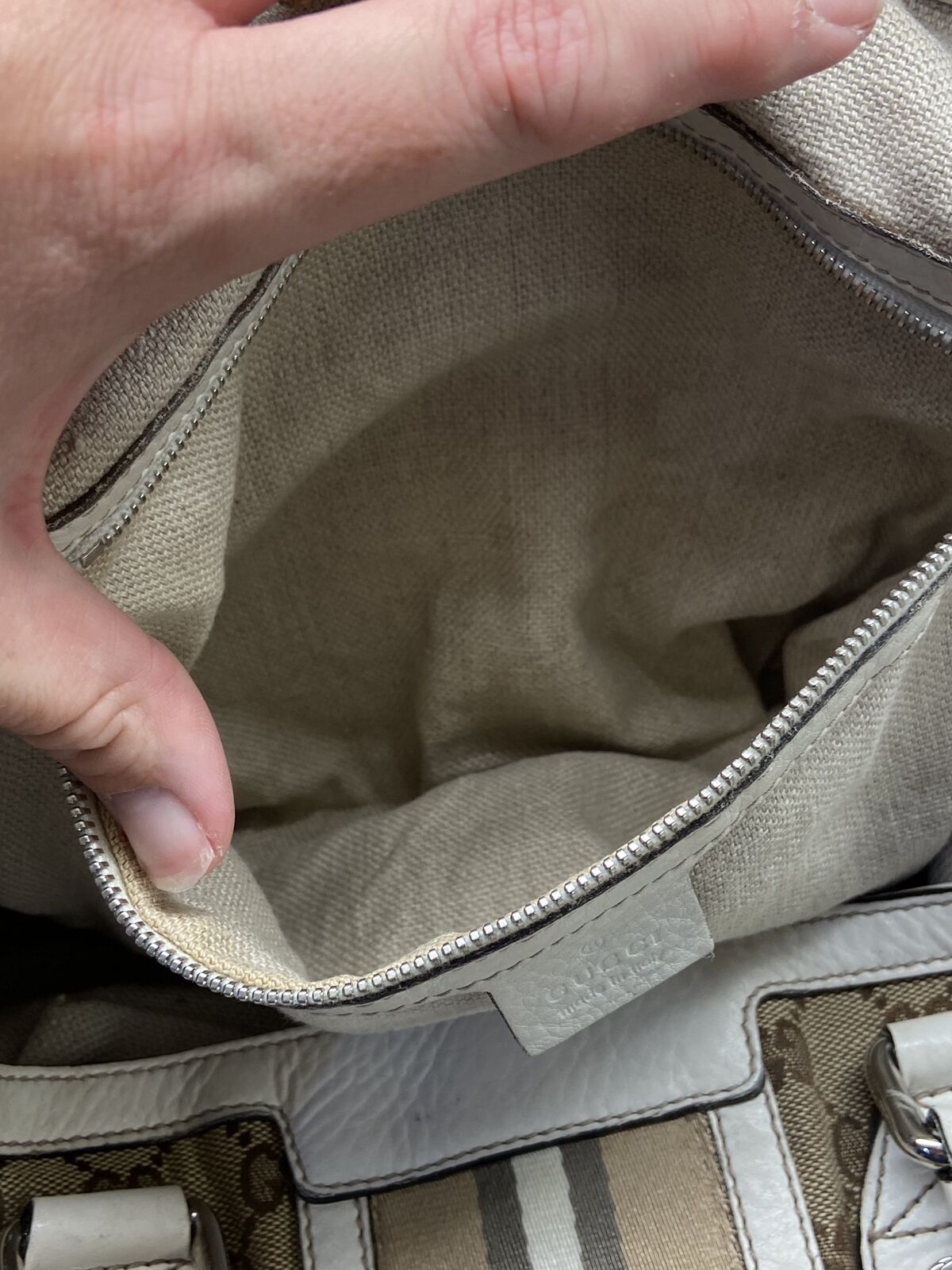 ApplePayAuthentic Gucci canvas and white leather tote bag. This bag is in good condition. Clean inaide and out, no smell and cracking. The call out is 2 minor small holes in the canvas on each of the bag but other than that the bag is in good condition. Will come with a COA