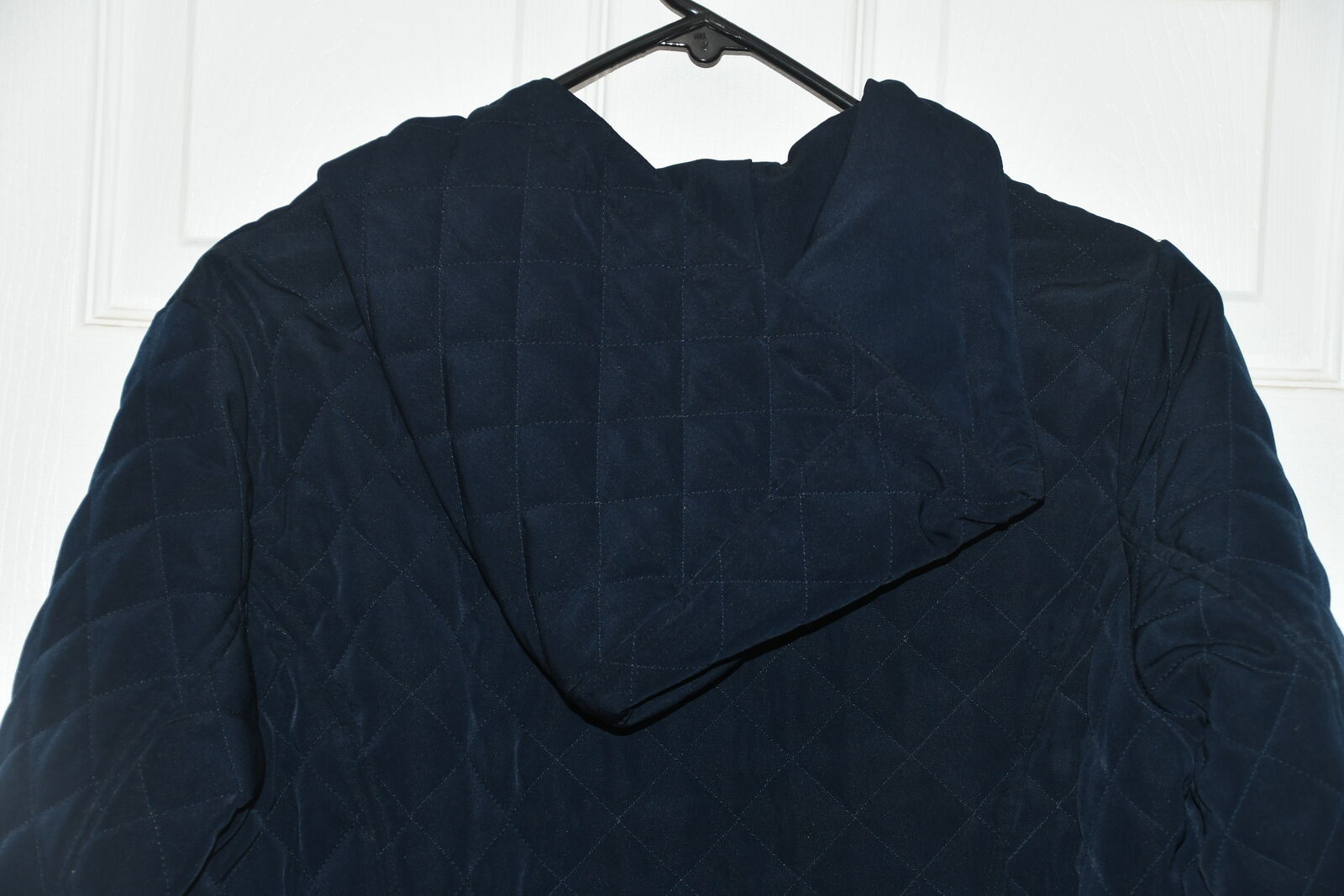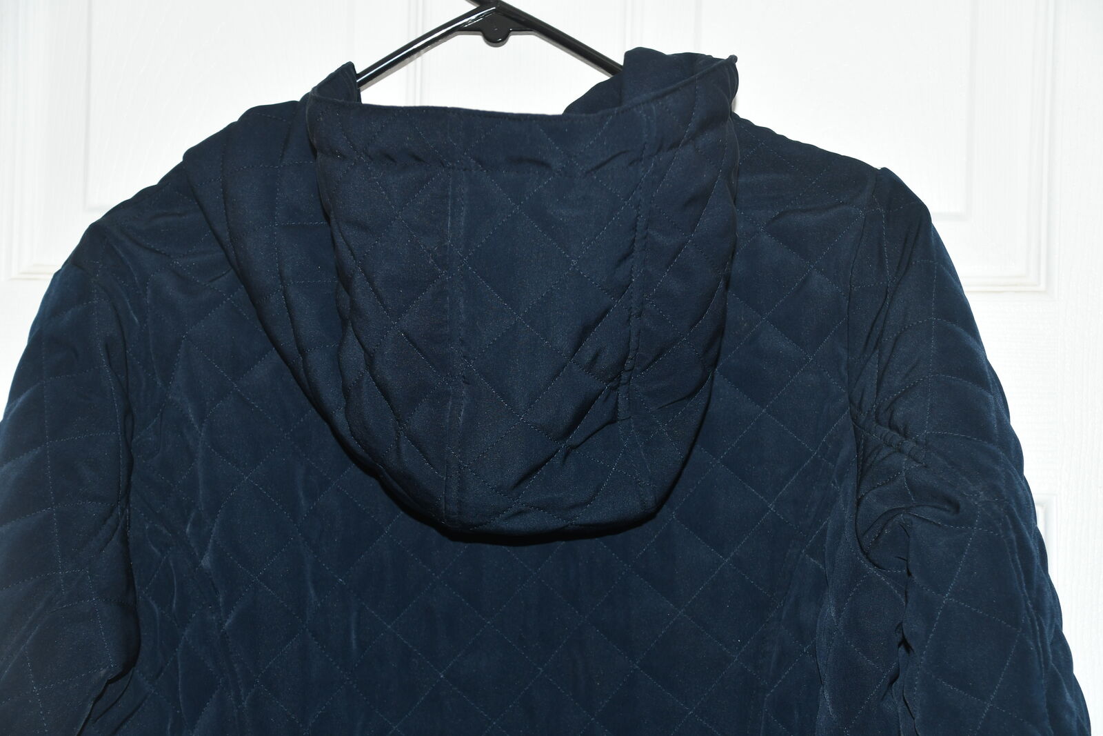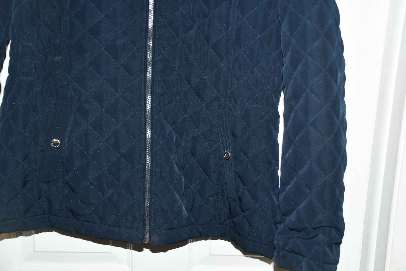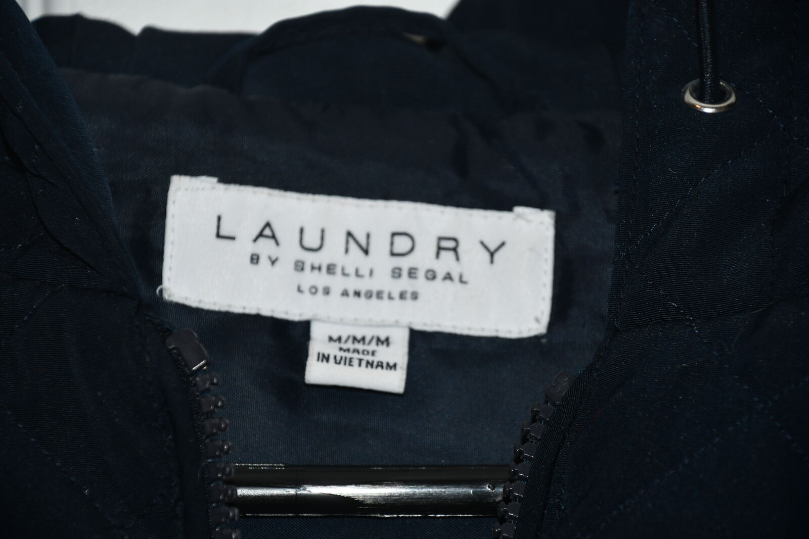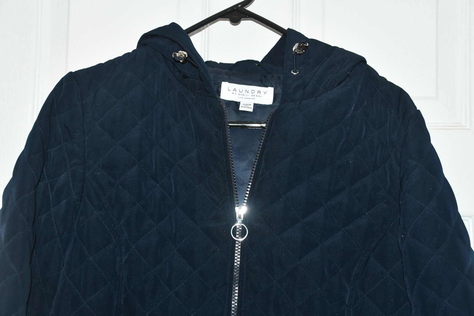 This WOMEN'S LAUNDRY COAT/JACKET with HOOD is SIZE M. It is DARK BLUE. It is about 19" across the chest area. PLEASE DOUBLE CHECK YOUR SIZE AS IT IS NOT AVAILABLE TO BE TRIED ON OR RETURNED. It is ZIPPERED with 2 POCKETS. It is 100% POLYESTER. It is MACHINE WASHABLE. It is CLEAN! Our home is smoke free. Questions??? Please ask. We are located in Plain City. Cash only please.