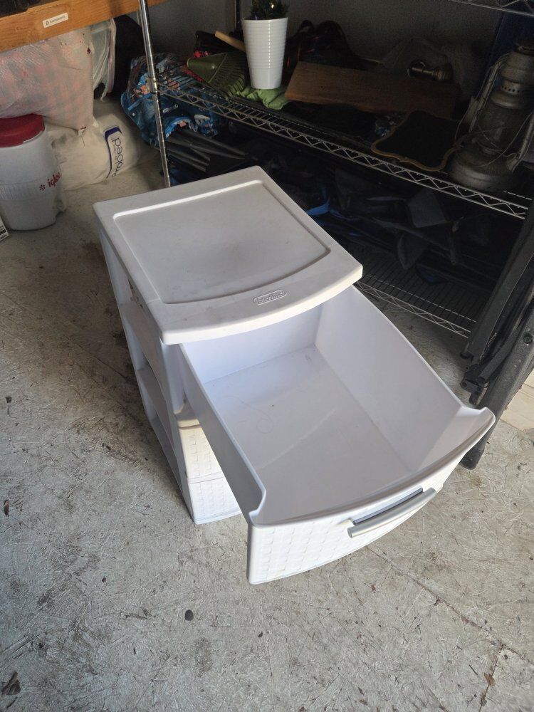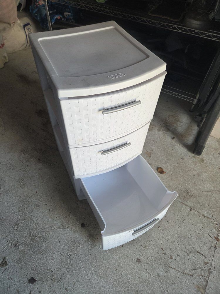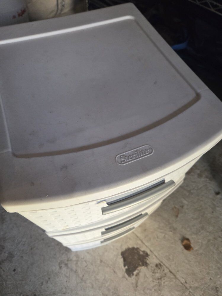 Sterilite 3-drawer plastic storage cabinet in good condition. Sturdy design with smooth-sliding drawers and built-in handles. Ideal for garage storage, closet organization, office supplies, crafts, or kids’ rooms. Shows light cosmetic wear from normal use but fully functional and clean. Compact size makes it easy to fit in tight spaces while still offering plenty of storage. Brand: Sterilite Drawers: 3 Color: White Material: Durable plastic Local pickup only. Cash or Venmo accepted. Message me with any questions.