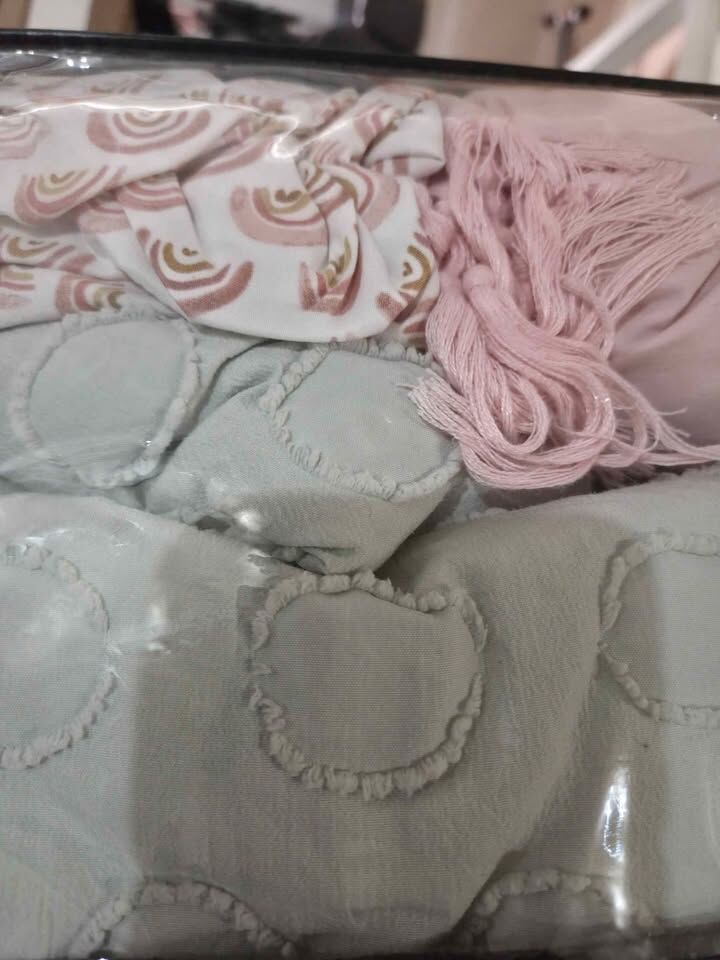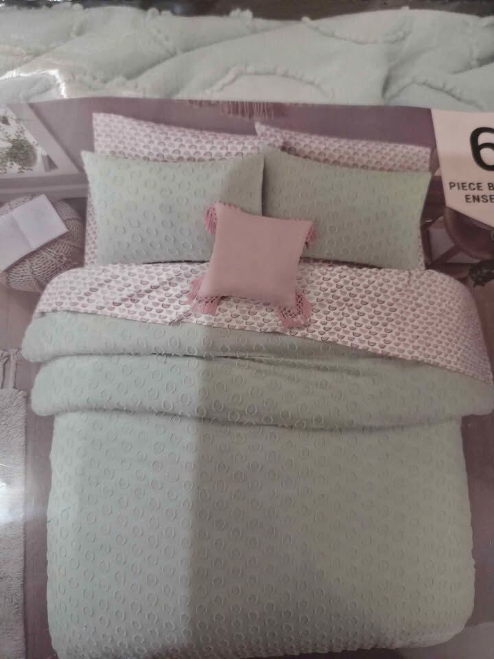Venmo6 pieces are : fitted sheet, top sheet, pillow case, comforter, shampoo, decorative pillow plus extra matching throw pillow with tassels. Pattern is pastel pink and green, rainbows, and dots