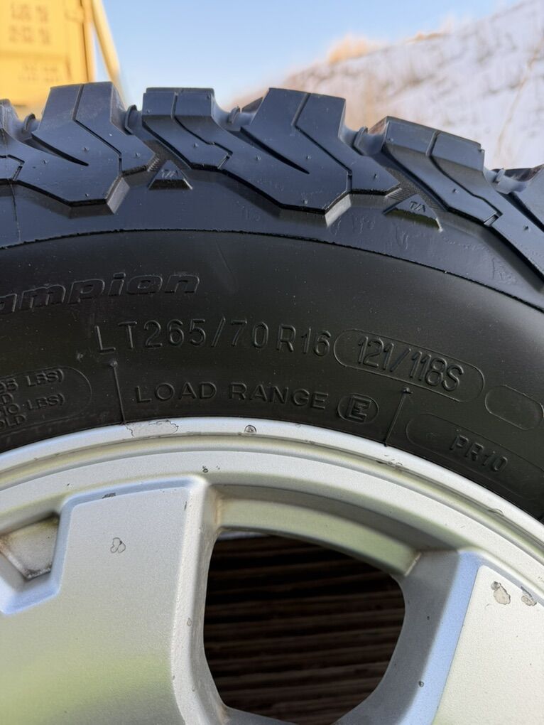 VenmoI have 4 Tacoma Wheels And Tires 265/70/R16 BFG K02. One tire has a bit more tred than the others.