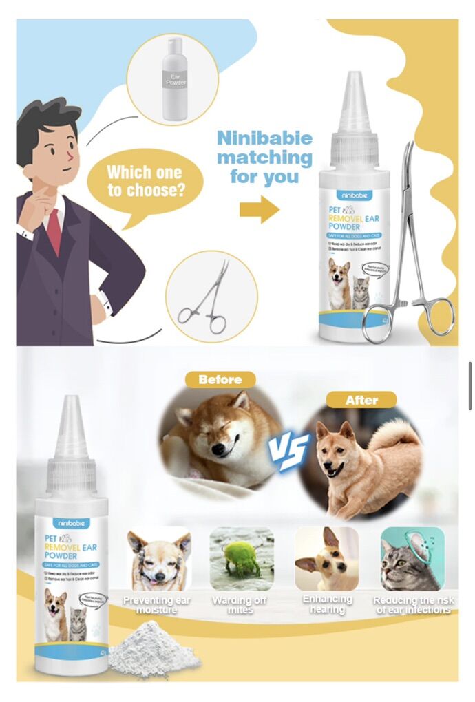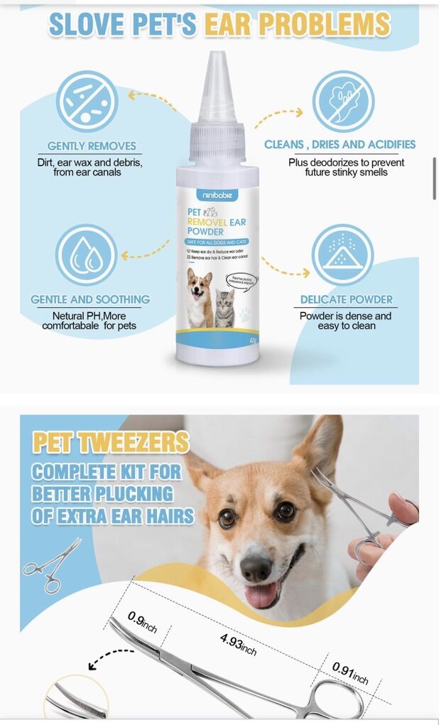 Ninibabie Dog Ear Cleaner,Dog Ear Powder for Hair Removal 42g,Dog Ear Infection Treatment with with 4.8inch Hemostat Locking Forceps Curved, Remove Ear Wax&Odor in Pets