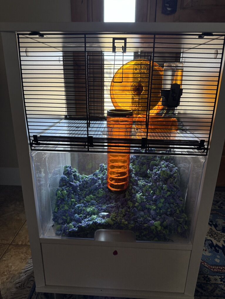 ApplePayThe Omlet Qute (or Qute Hamster Cage) is a stylish, easy-to-clean small animal habitat designed to look like furniture, featuring separate upper living/feeding areas and a deep lower bedding tray for burrowing, connected by a lift-and-twist tube for quick cleaning without disturbing pets. Some wear but everything fully functional and all accessories included. Pick up in Heber City.