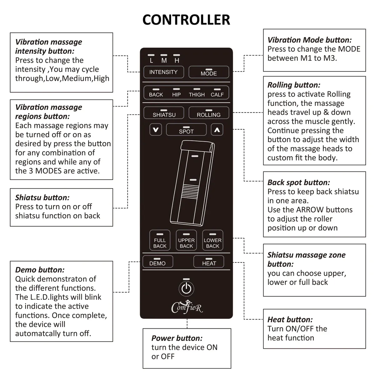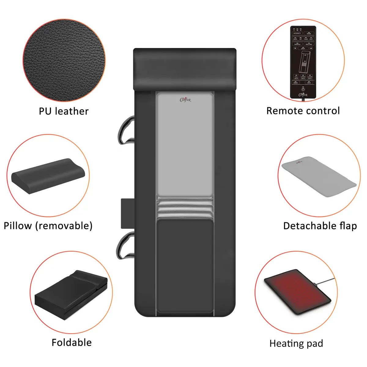 Select the specific massage area: shoulder, back, lumbar, legs, or combine some areas to best suit your needs.